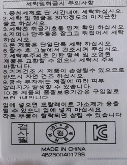 | 세탁방법 및 취급시 주의사항 | 중성세제로 단 시간내에 세탁하십시오.(케어라벨참고) |
