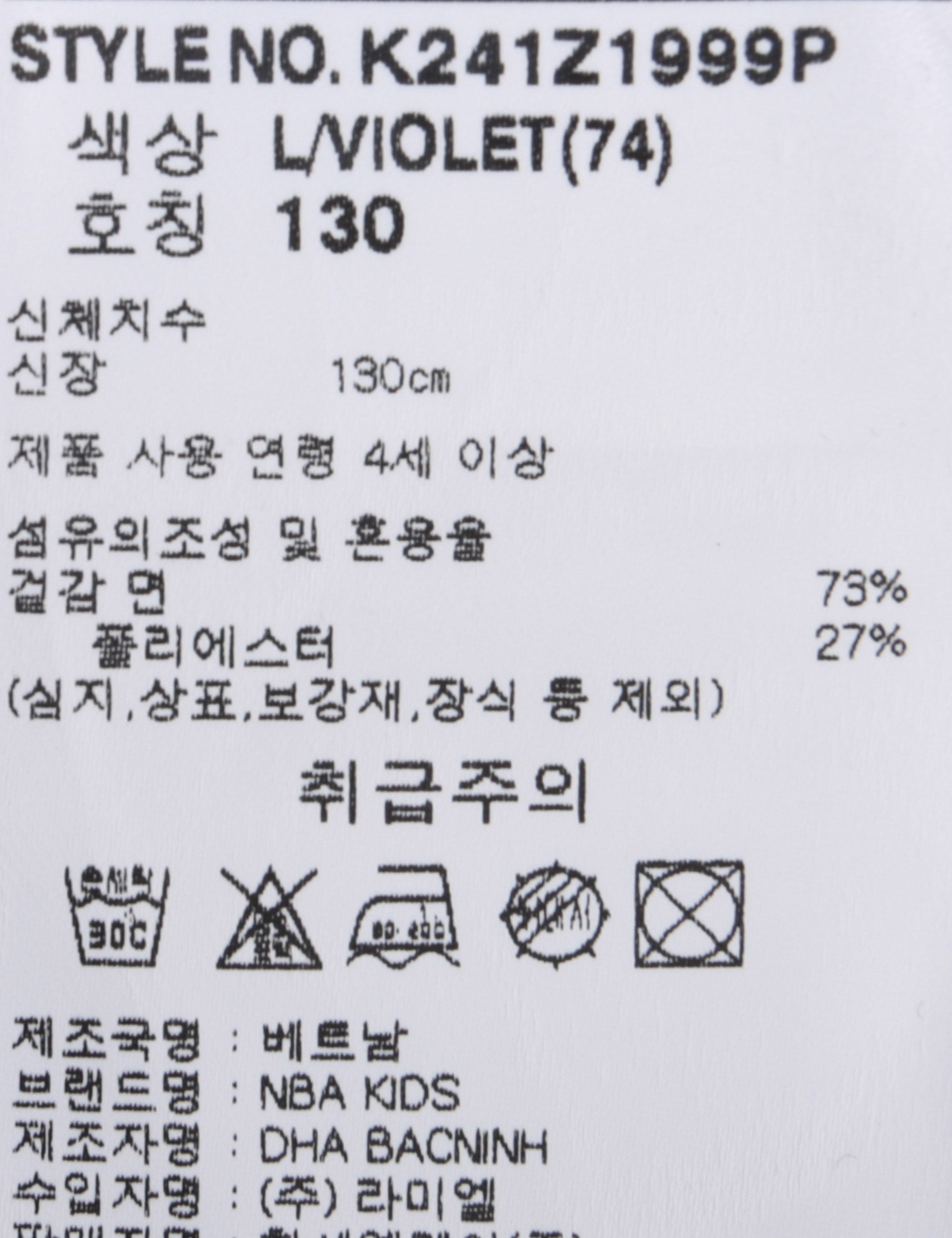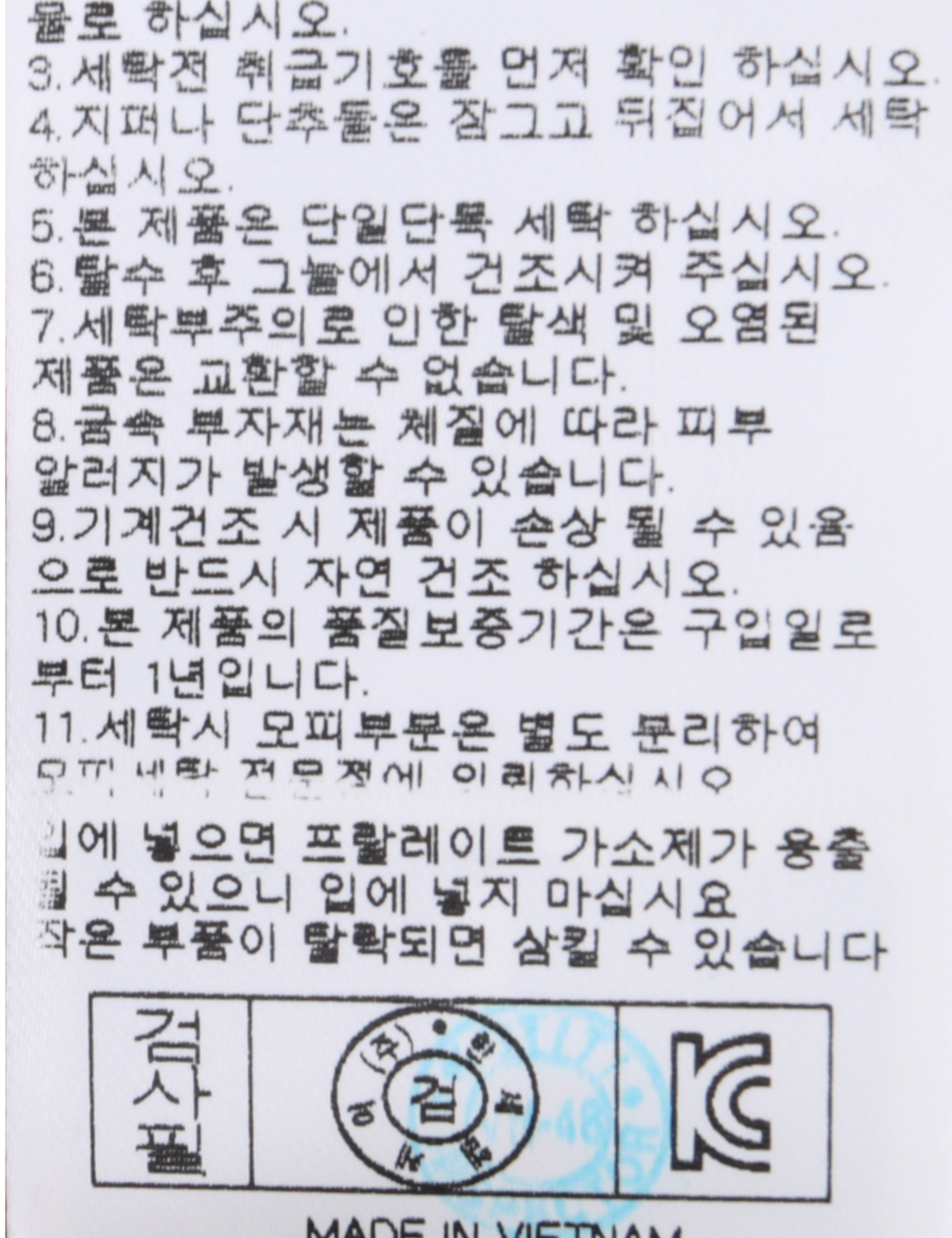| 세탁방법 및 취급시 주의사항 | 본 제품은 손세탁 하십시오.(케어라벨참고) |