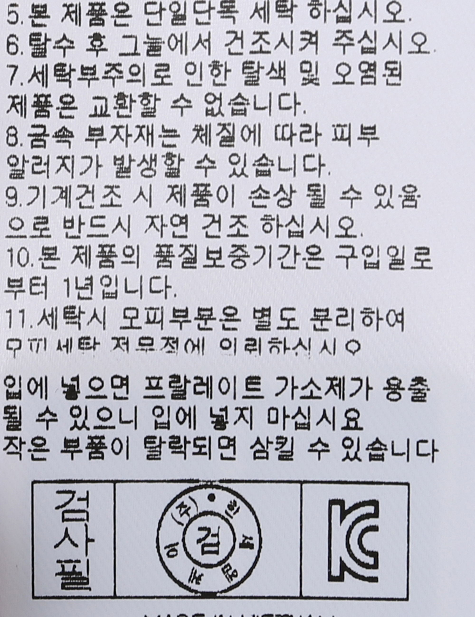 | 세탁방법 및 취급시 주의사항 | 본 제품은 손세탁 하십시오.(케어라벨참고) |