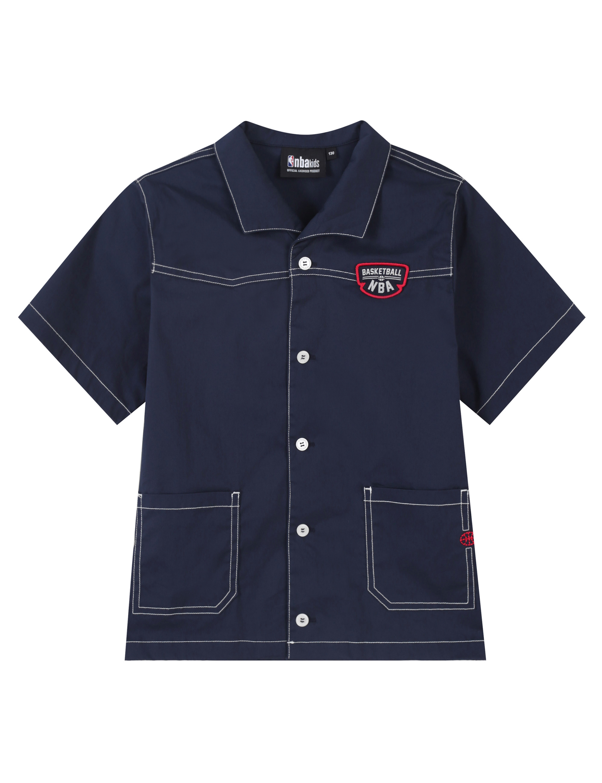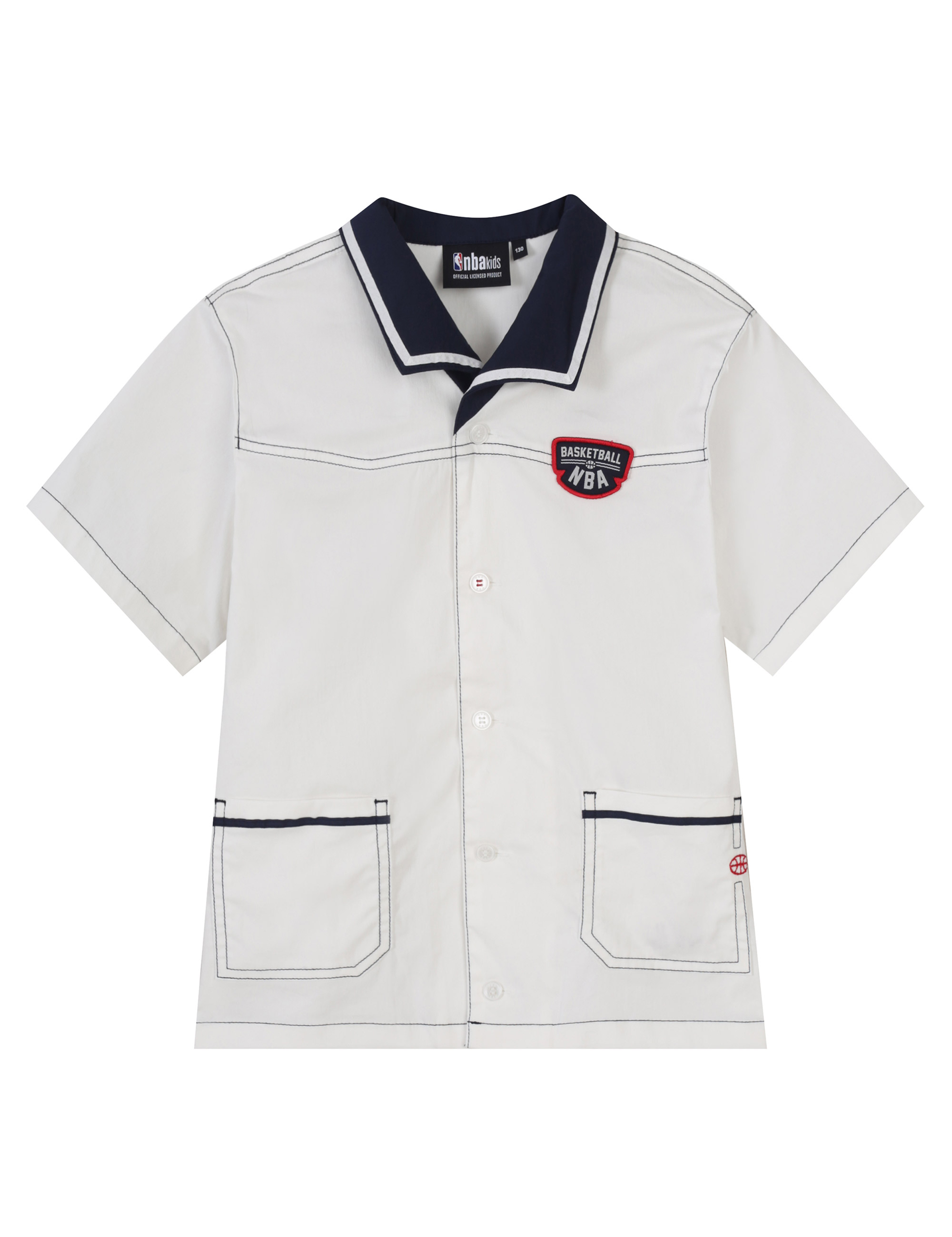 -가슴에 와펜과 포켓에 포인트로 들어가는 농구공 모양 자수, 단추 실컬러에 레드 컬러가 포인트