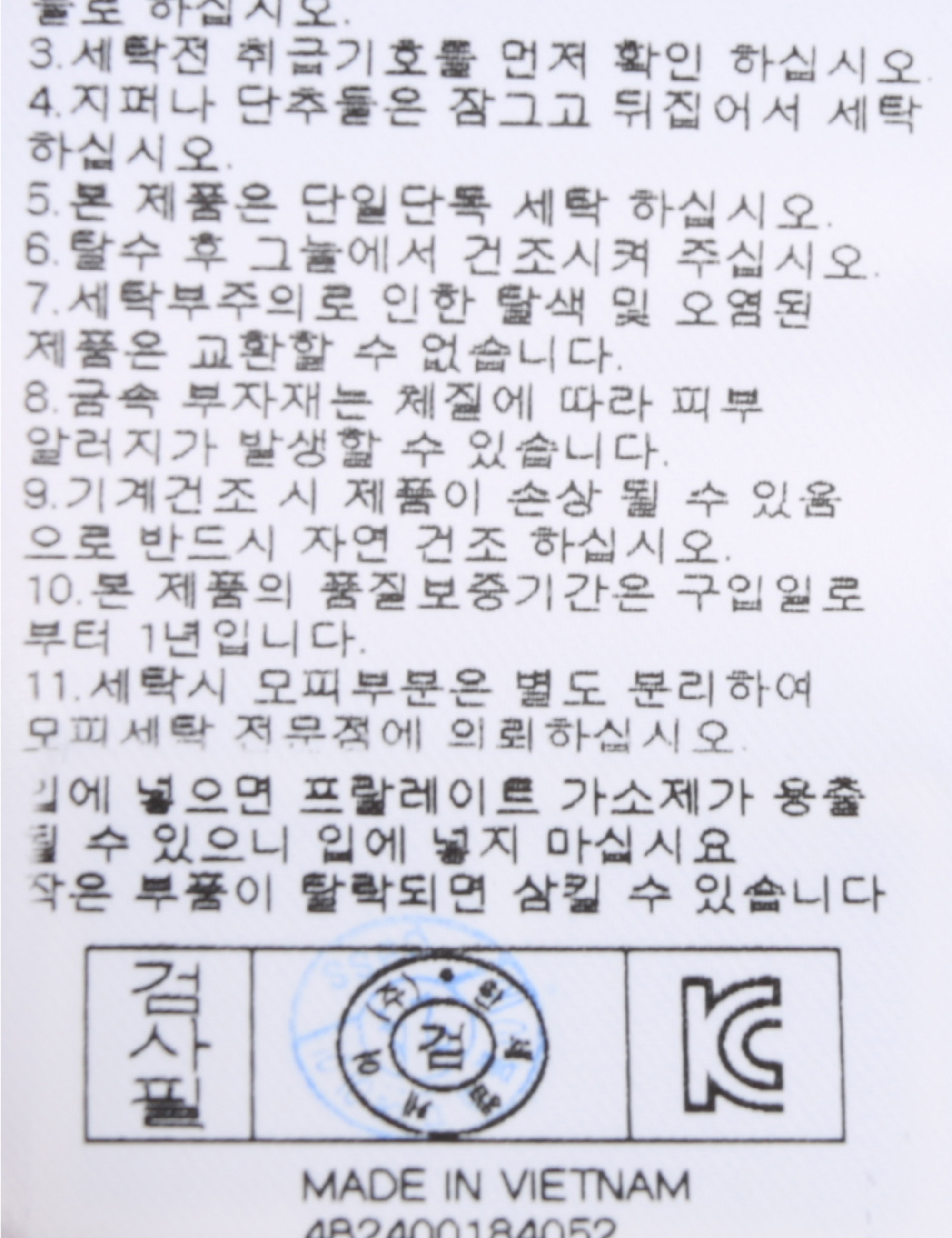 | 세탁방법 및 취급시 주의사항 | 본 제품은 손세탁 하십시오.(케어라벨참고) |