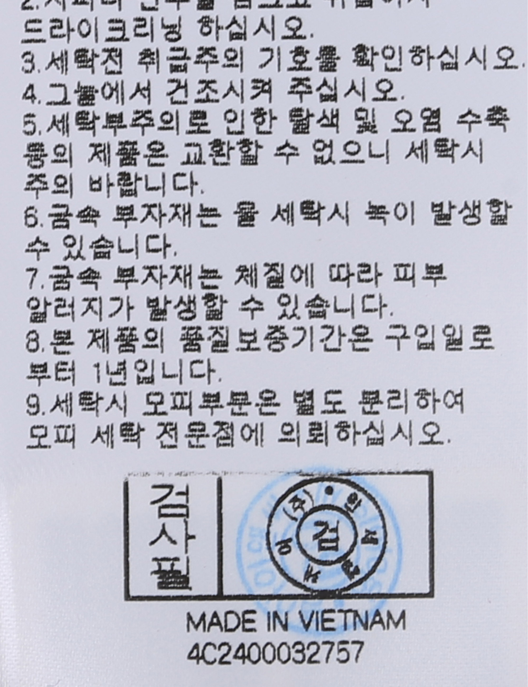 | 세탁방법 및 취급시 주의사항 | 본 제품은 반드시 드라이크리닝 하십시오.(세탁라벨참고) |