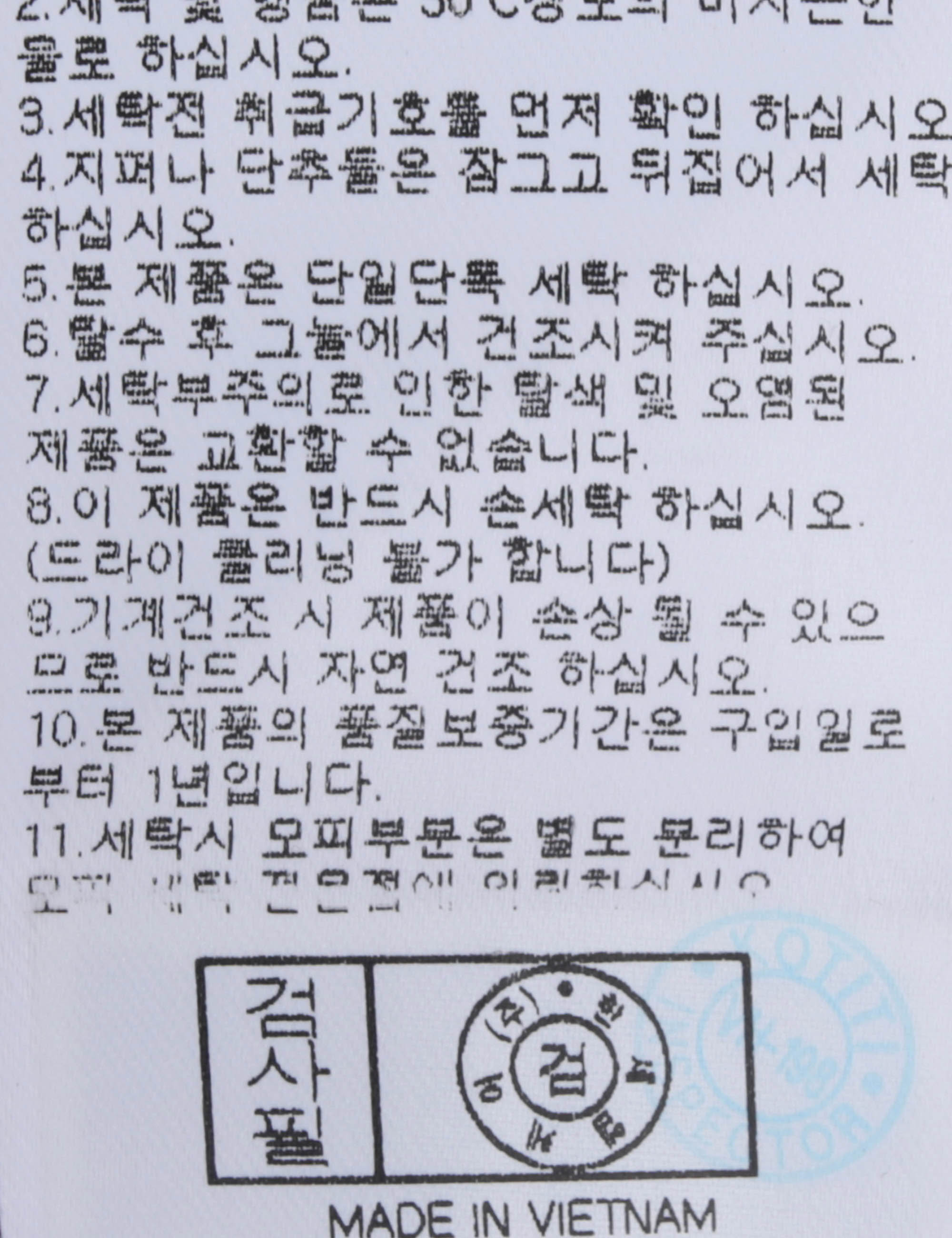 | 세탁방법 및 취급시 주의사항 | 본 제품은 손세탁 하십시오.(케어라벨참고) |