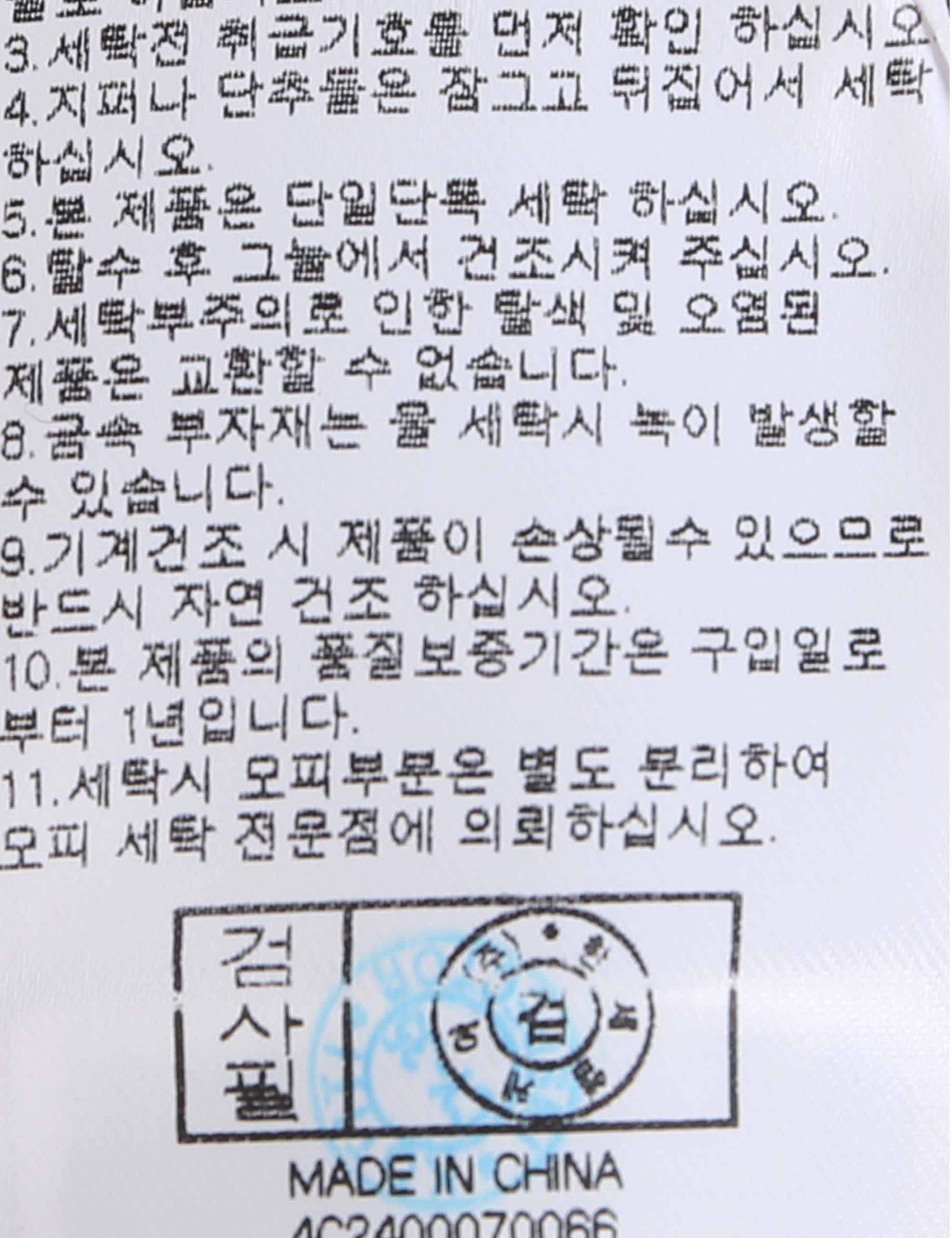 | 세탁방법 및 취급시 주의사항 | 본 제품은 손세탁 하십시오.(케어라벨참고) |
