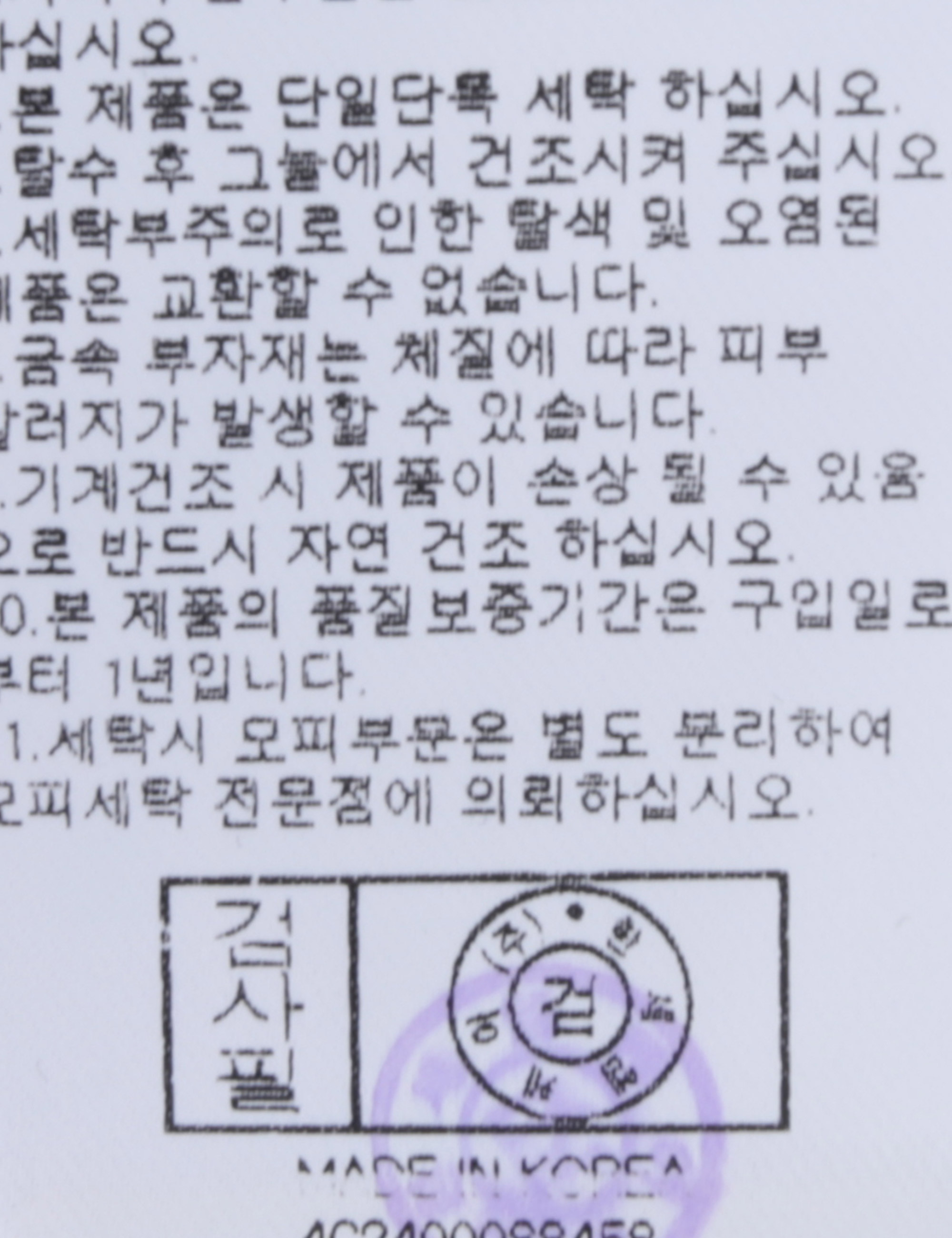 | 세탁방법 및 취급시 주의사항 | 본 제품은 손세탁 하십시오.(케어라벨참고) |