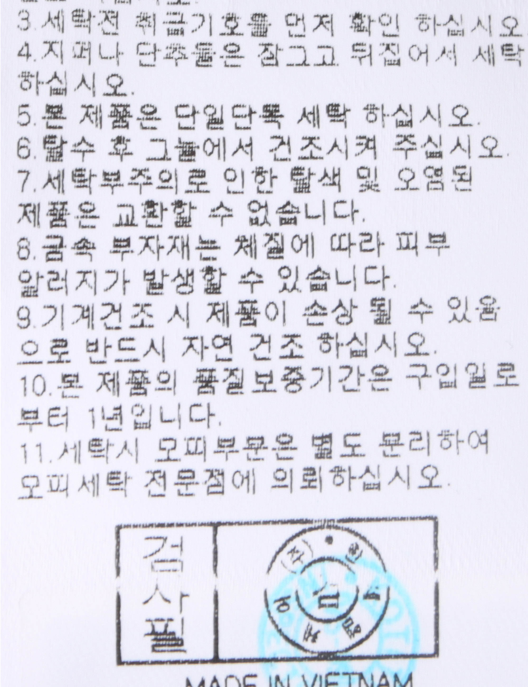 | 세탁방법 및 취급시 주의사항 | 본 제품은 손세탁 하십시오.(케어라벨참고) |