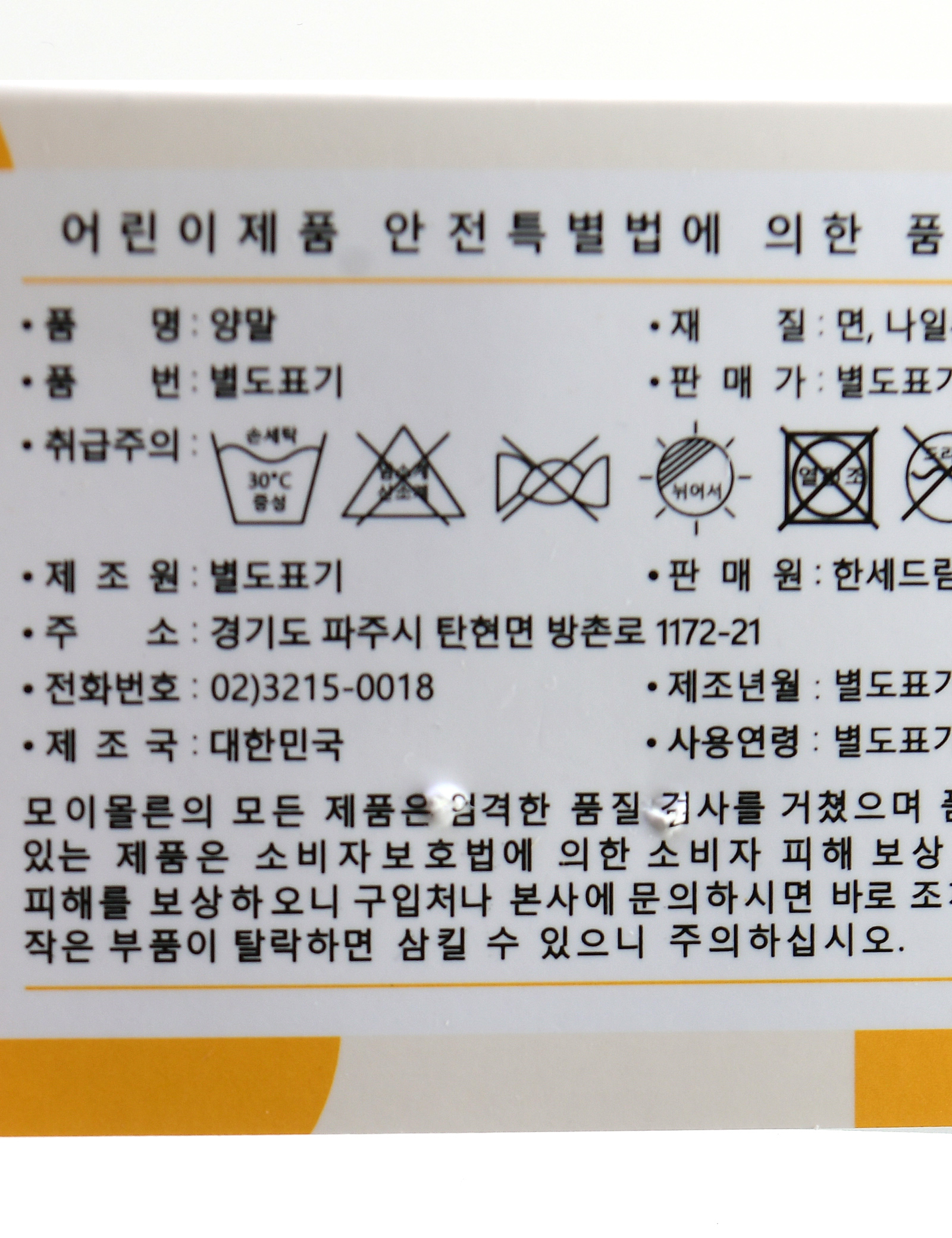 | 수입여부 | 본 세품은 손세탁 하십시오(케어라벨 참고) |