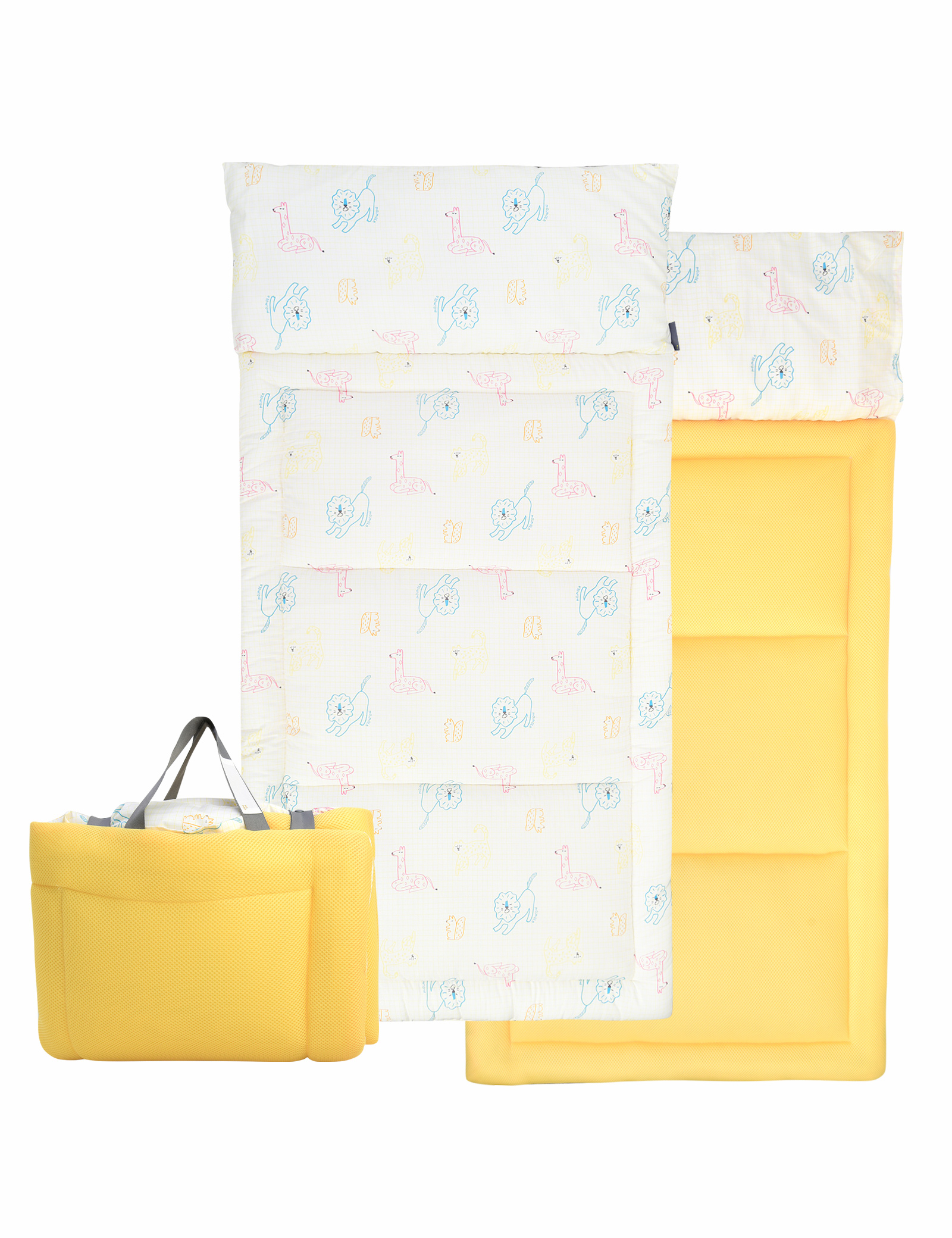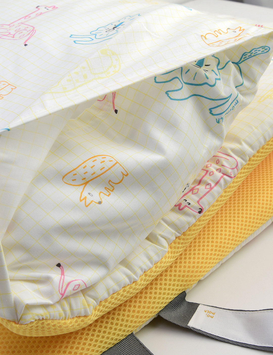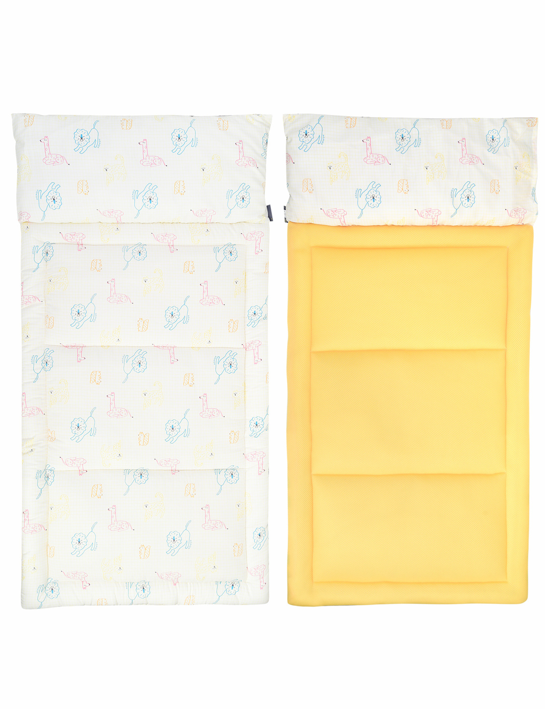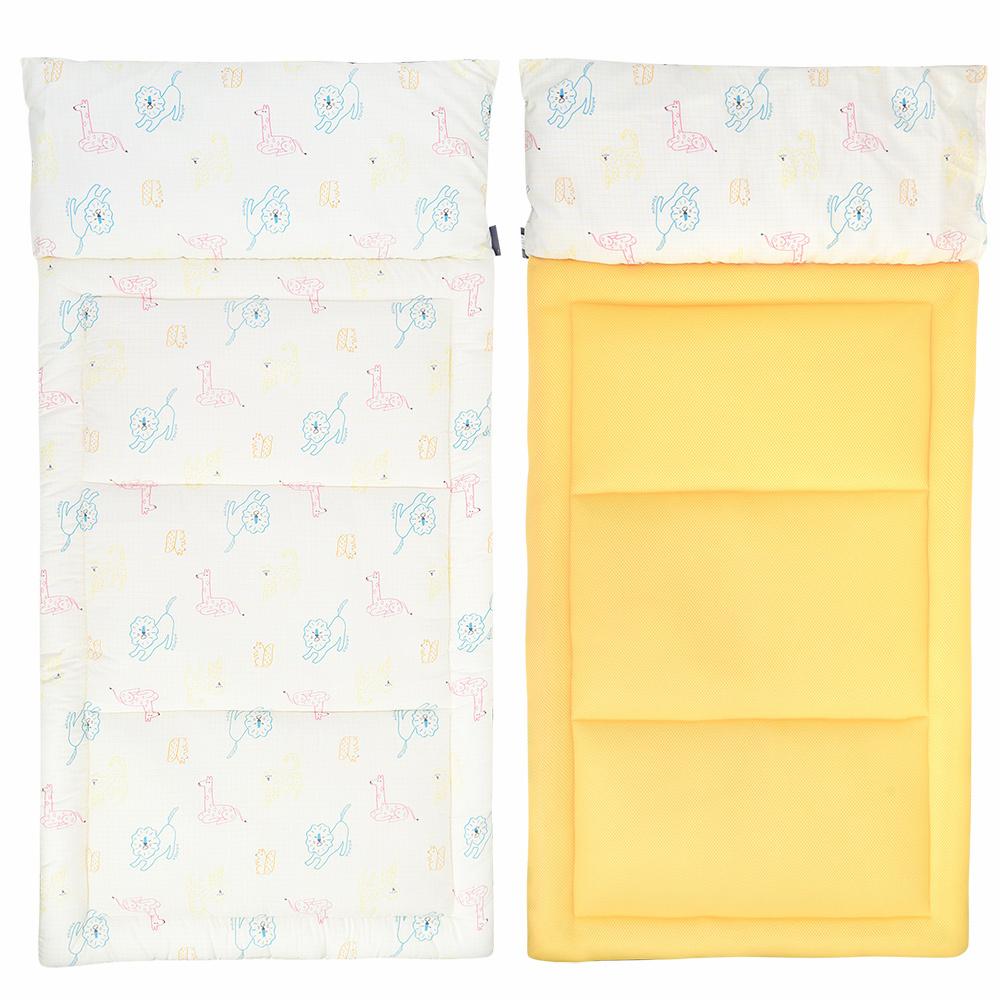 격자 그리드 위에 동물나염이 컬러풀하게 디자인된 어린이집 낮잠패드.