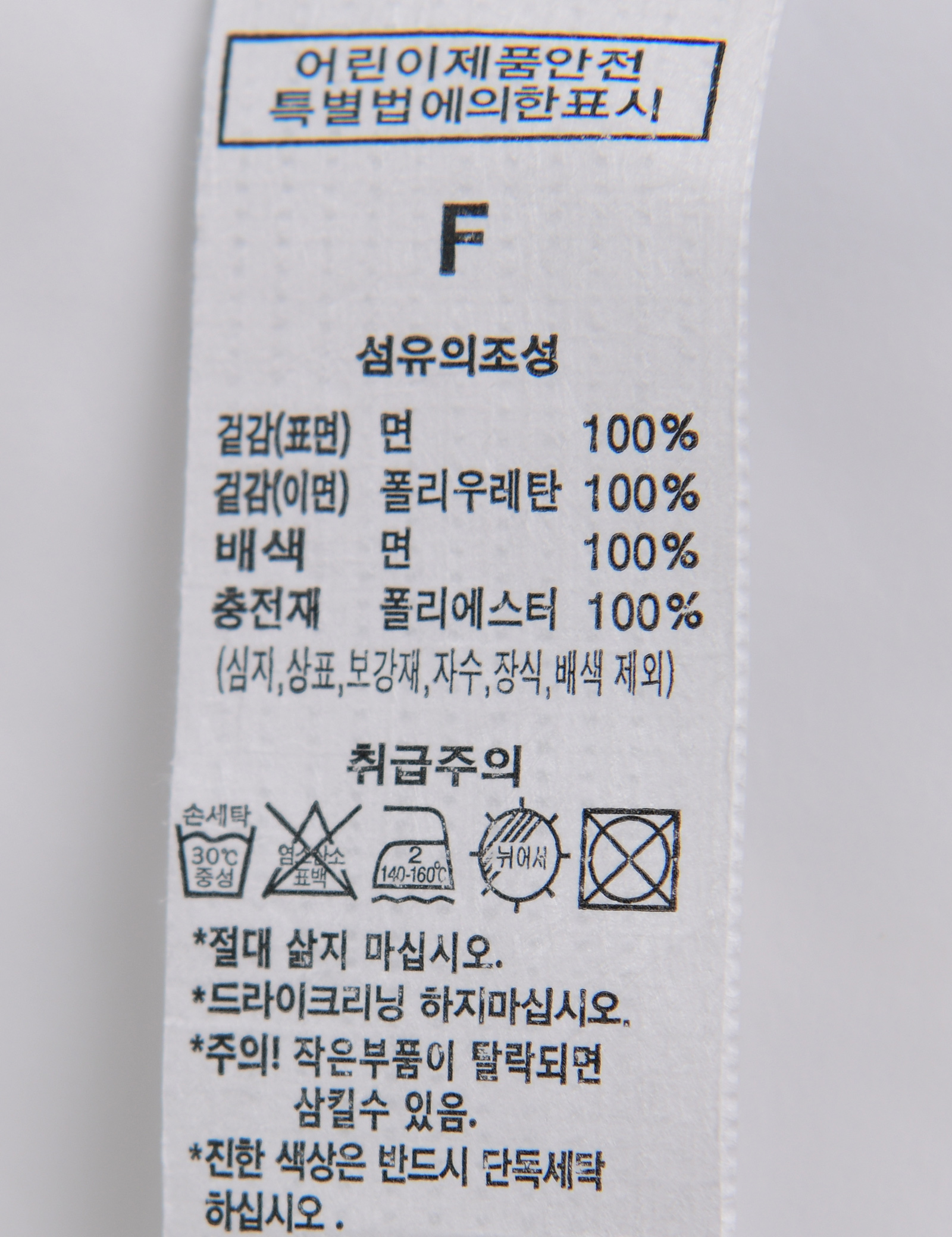 브랜드 홈 바로가기| 품명 및 모델명 | (겉감/표면/배색)면100%(겉감/이면)폴리우레탄100%(충전재)폴리에스터100% |