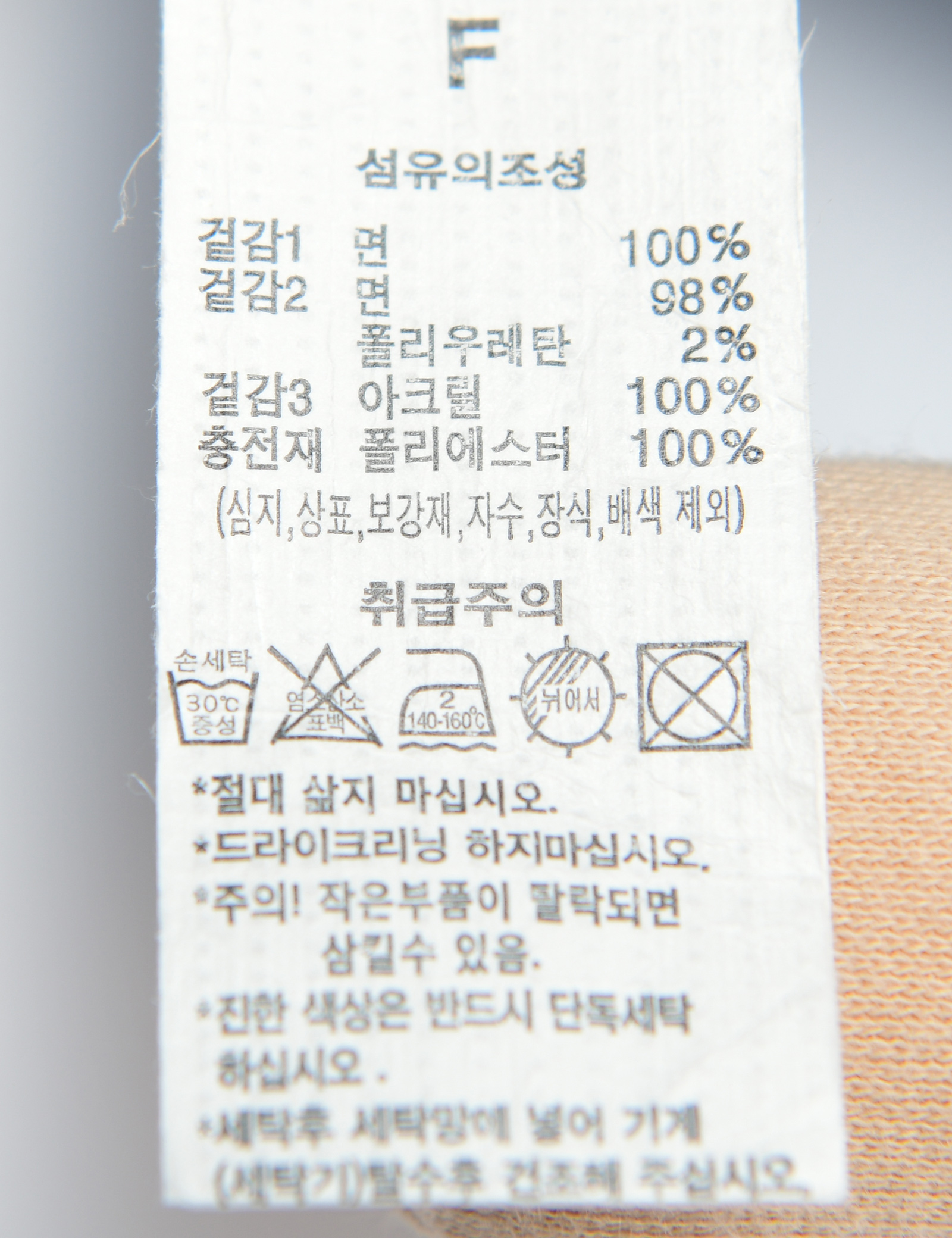 브랜드 홈 바로가기| 품명 및 모델명 | (겉감1)면100%(겉감2)면98%,폴리우레탄2%(겉감3)아크릴100%(충전재)폴리에스터100% |