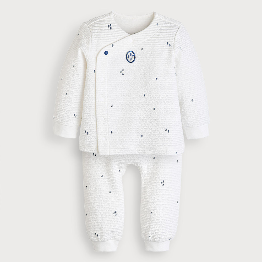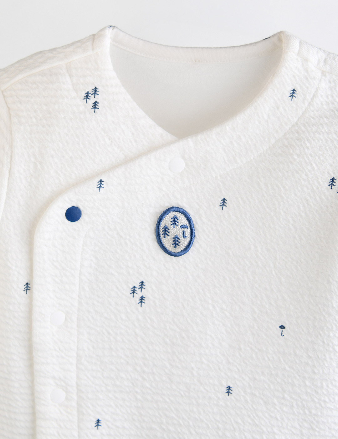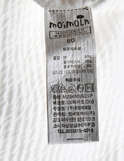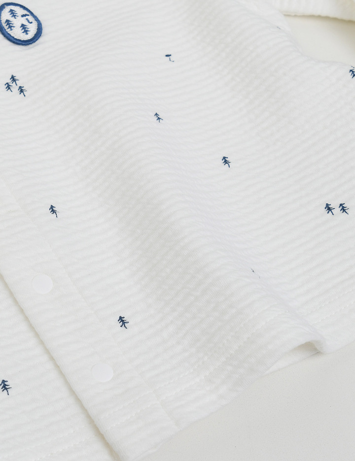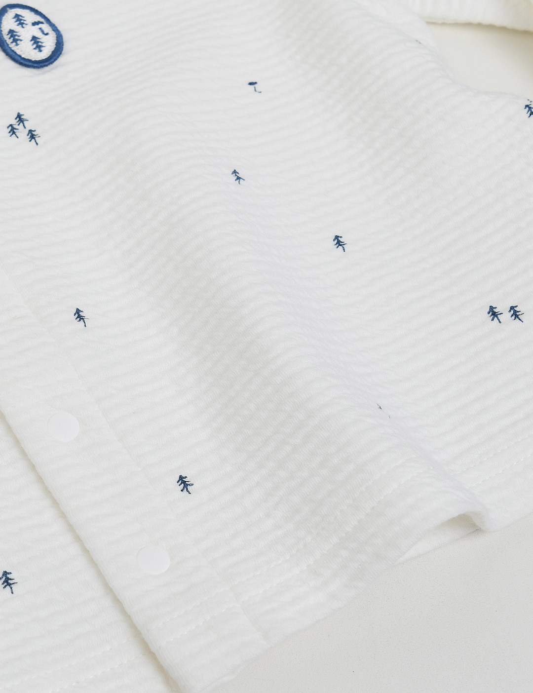 도톰한 이중지 자가드 소재에뽀얀 화이트 컬러로우리 아이의 얼굴을 화사하게 해주며,와펜 포인트로 한끗을 더한 실내상하