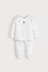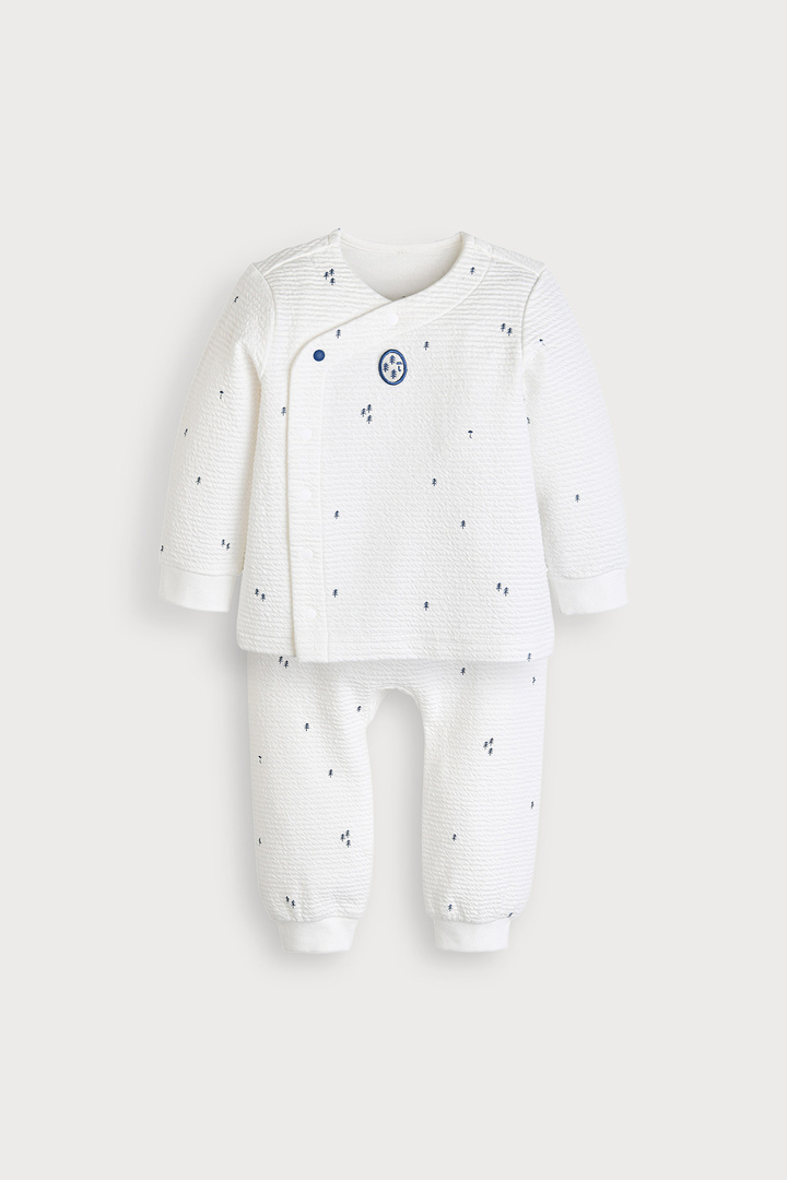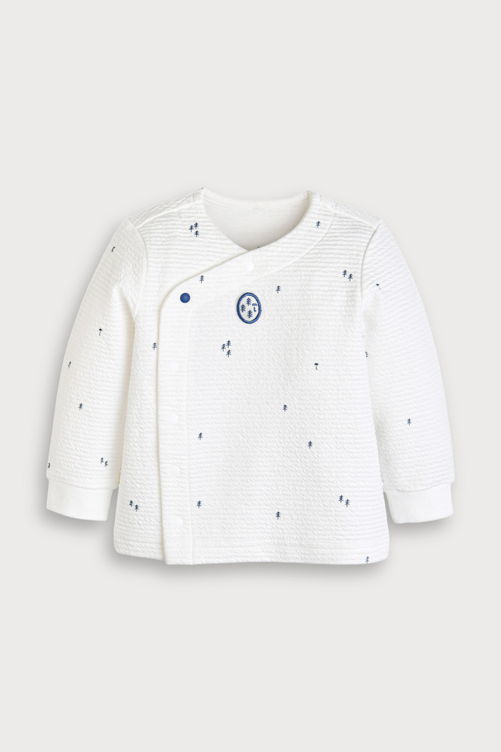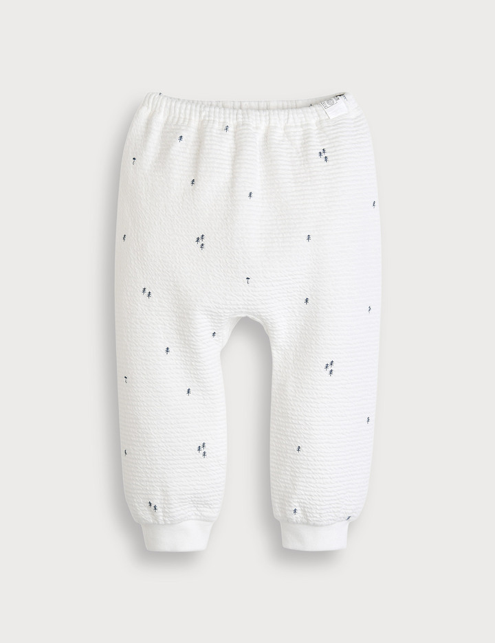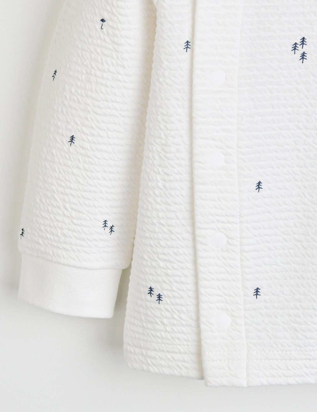 도톰한 이중지 자가드 소재에뽀얀 화이트 컬러로우리 아이의 얼굴을 화사하게 해주며,와펜 포인트로 한끗을 더한 실내상하