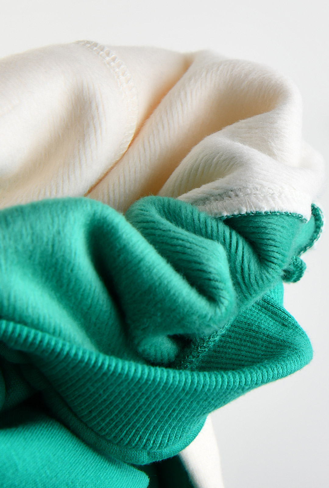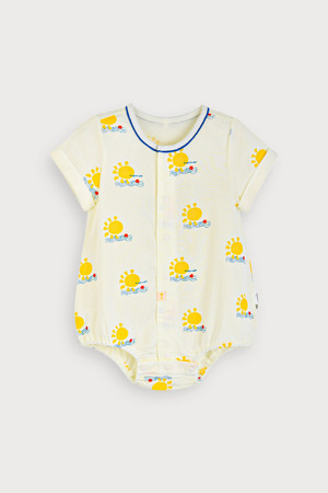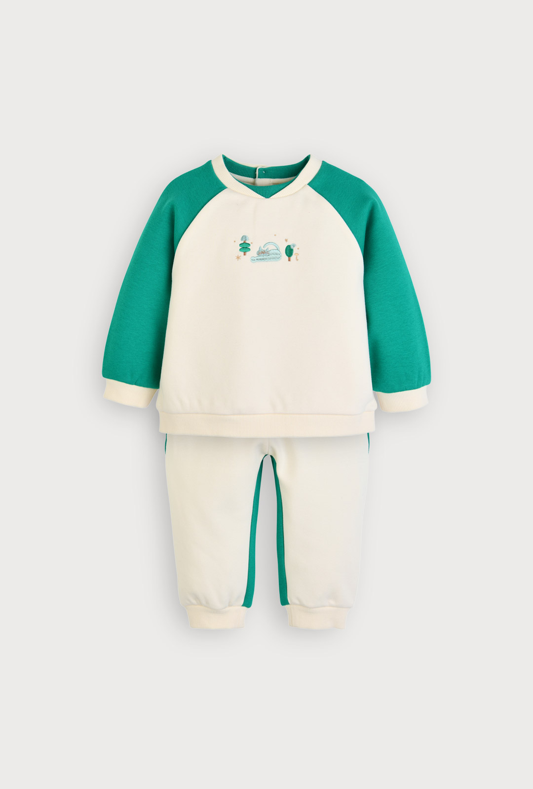 뽀얀 아이보리 컬러에 쨍한 민트 컬러를 배색으로 주어 무난하면서도 돋보이는 느낌을 주는 깨끗하고 유니크한 상하복. 네크 립단을 이중으로 주고바지 앞뒤 배색을 준 점이다른 옷들과 달라보이게 유니크한 느낌을 주고, 가슴 중심에 은은한 컬러로 놓은 고양이 자수가 귀여운 포인트인 아이템