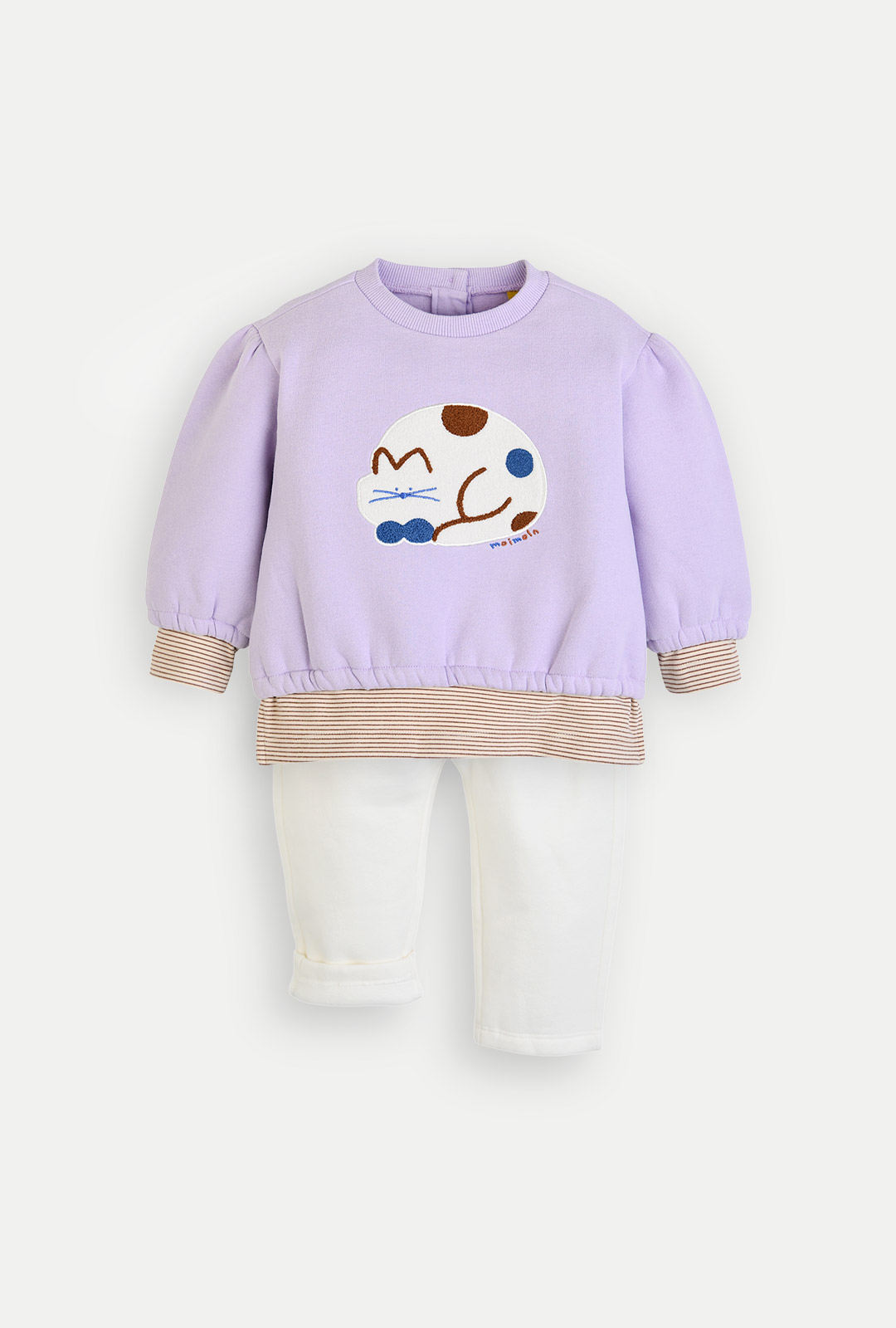 레이어드 형태 실루엣의양기모쭈리 상하복.소매와 상의 밑단에잔잔한 스트라이프 패턴으로포인트를 주었고,고양이의 보송보송함을 담은아플리케 자수로 귀여움을 더했으며,전체적으로 여유있는 핏으로편안하게 착용하기 좋은 아이템