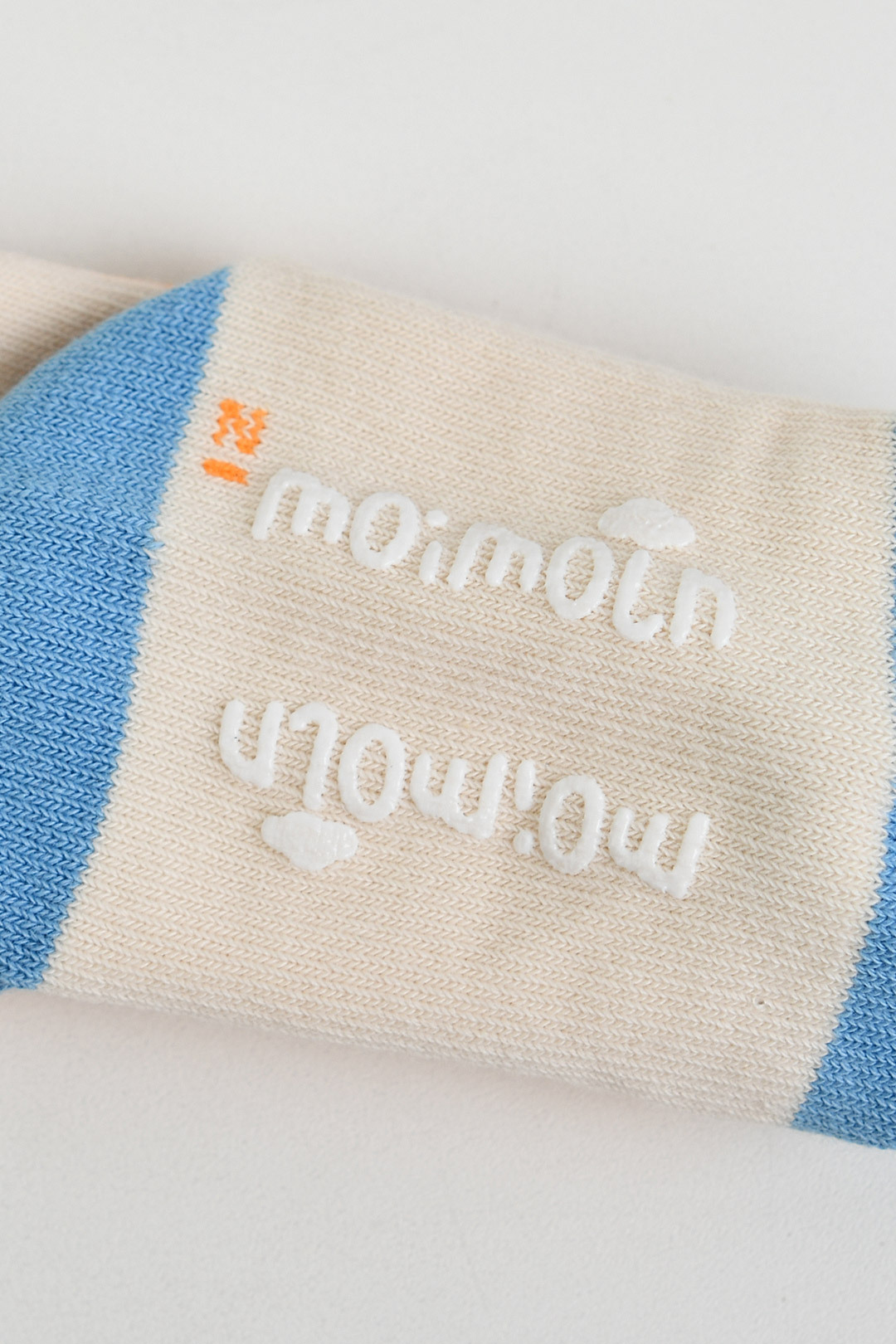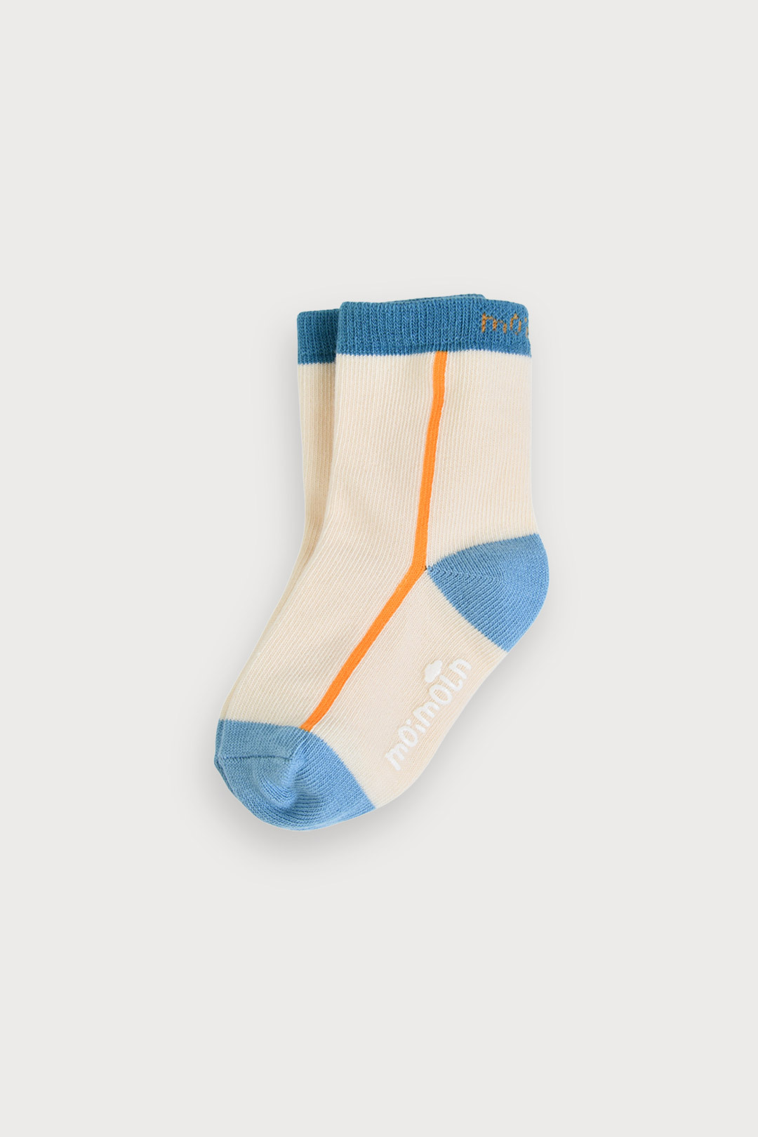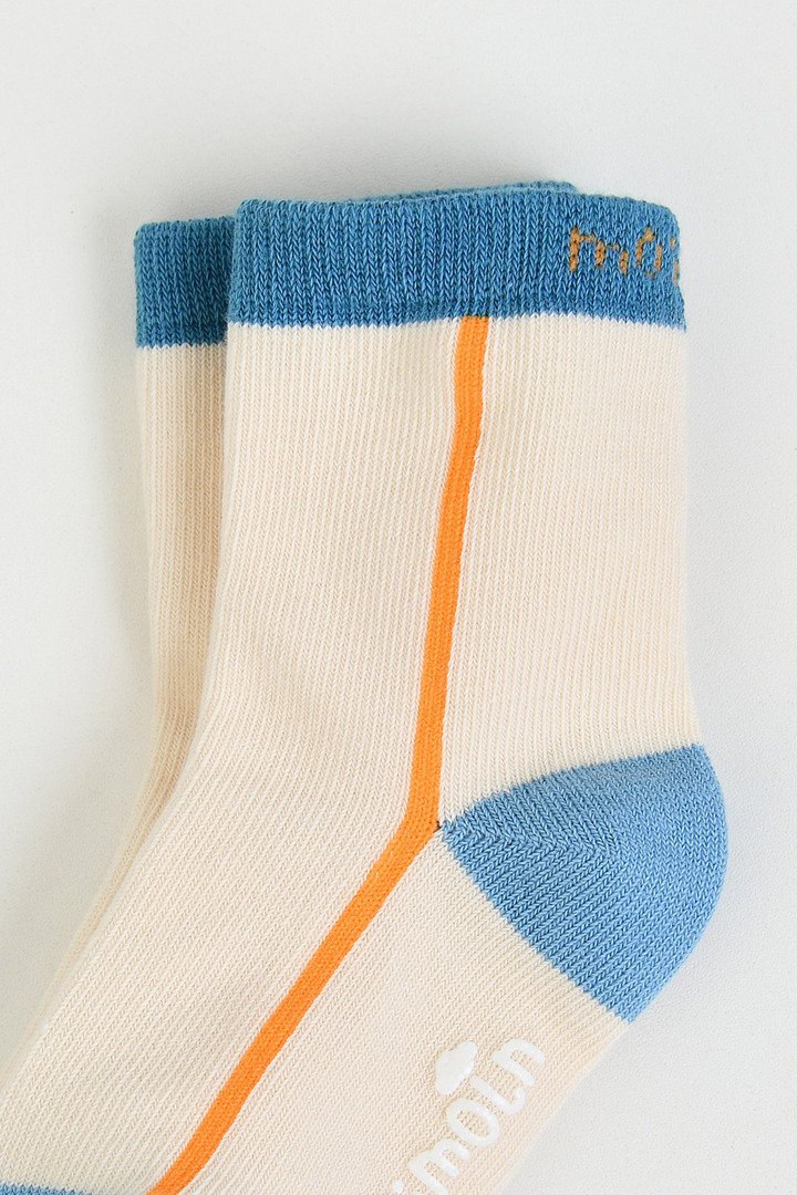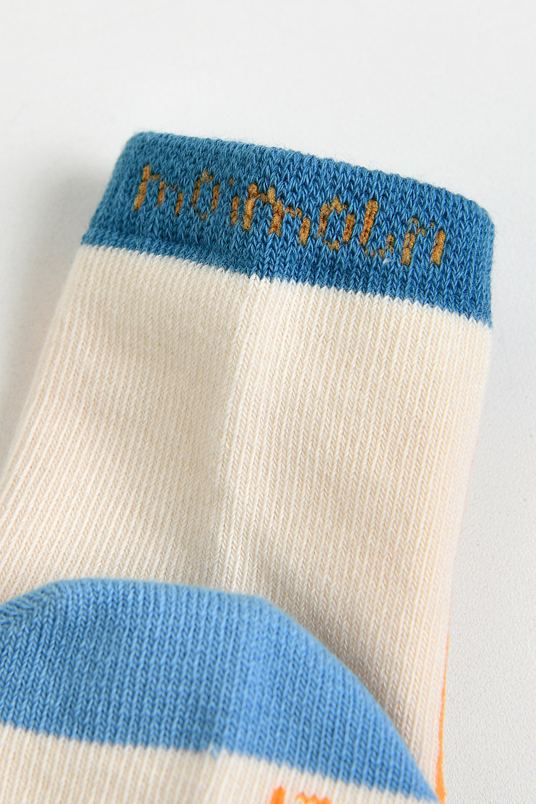 아이보리 컬러 베이스에 블루컬러 배색을 주고 양말 옆면을 따라 오렌지 컬러의 포인트 라인으로 깔끔한 느낌을 더하면서도 유니크함을 살린 아이템