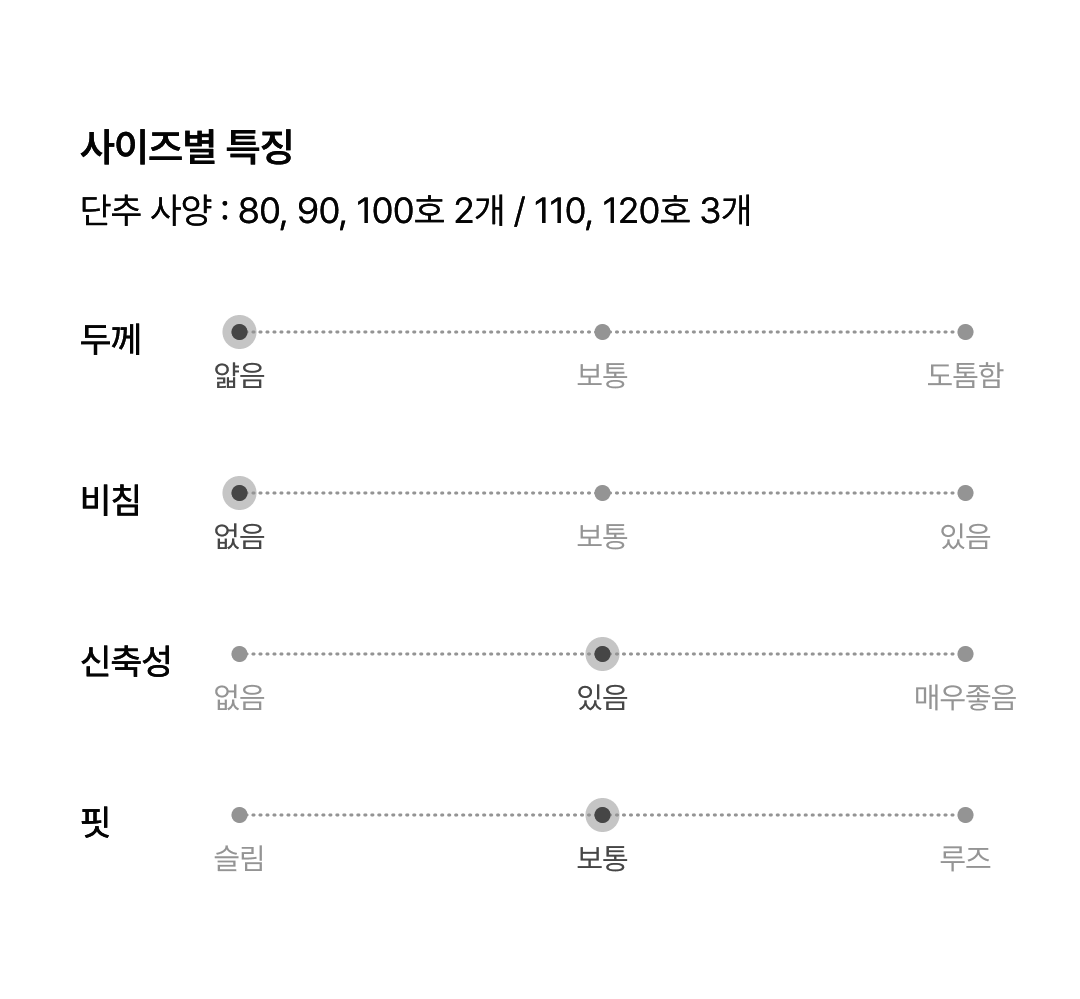 겉감(미니쭈리): 적당한 두께감과 부드러운 터치감으로 사계절 활용하기 좋은 소재 하의(다이마루 골지): 세로 줄무늬 조직으로 신축성이 뛰어나 활동적인 움직임에 최적화된 소재