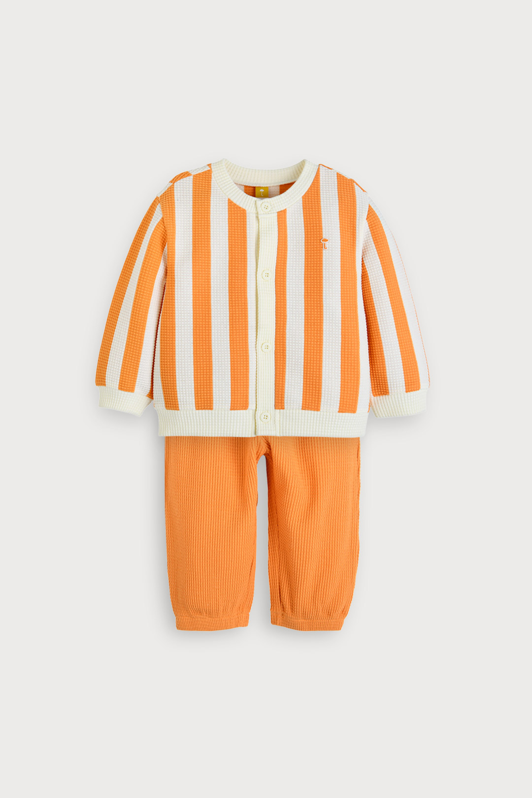 화사한 오렌지와 그린 컬러에 신축성 좋은 와플 소재를 사용한 가디건 상하복