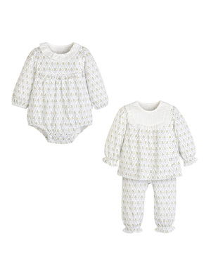 터치감이 부드럽고 스판기가 있어 아이들이 활동하기 편안한 면모달 소재의 런닝 세트. 클래식한 도형 패턴이 더해진 전판 나염과 어디에나 같이 입기 좋은 깔끔한 런닝으로 구성된 아이템