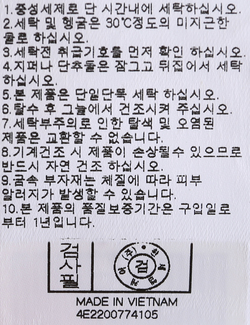 | 세탁방법 및 취급시 주의사항 | 본 제품은 손세탁 하십시오.(케어라벨참고) |