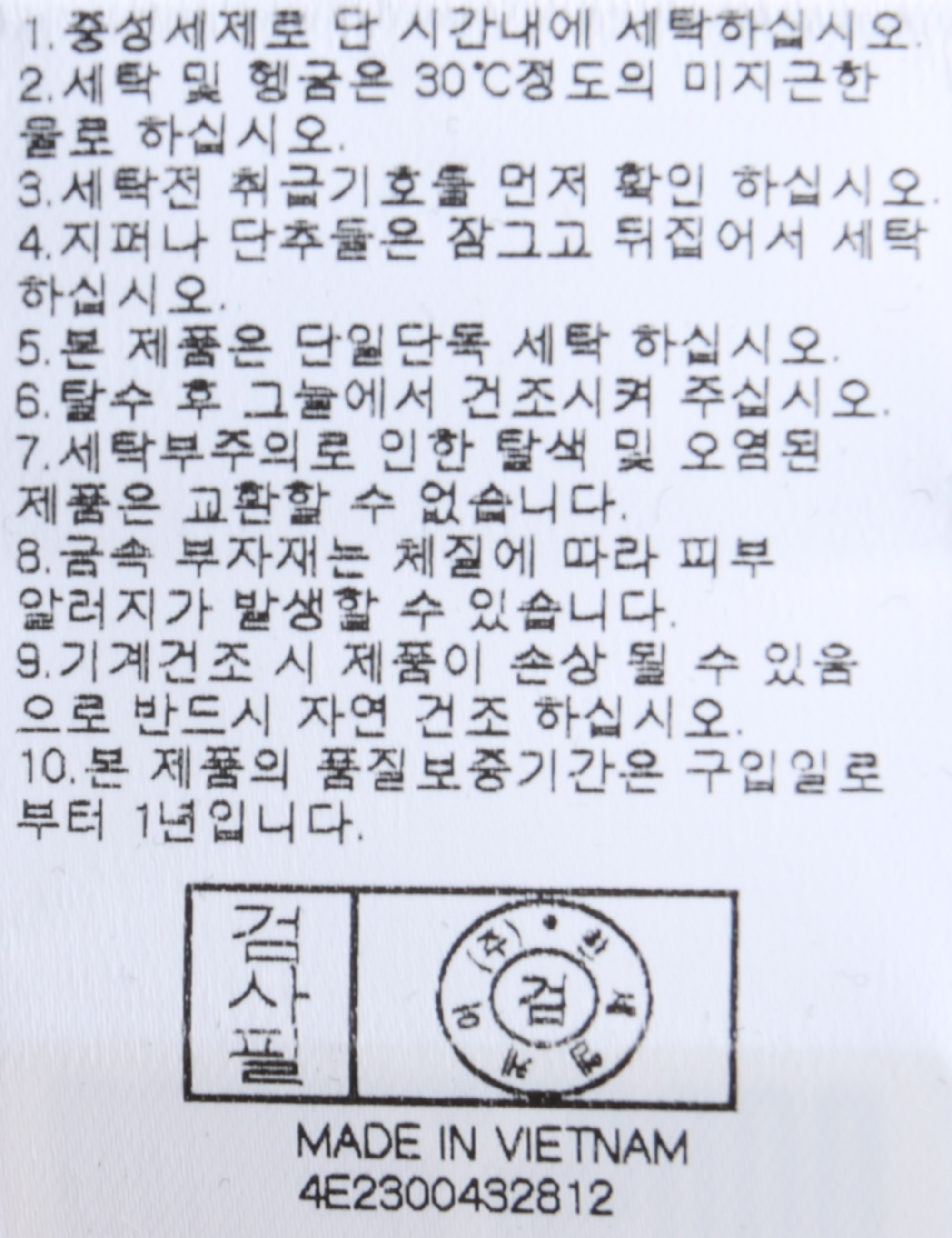 | 세탁방법 및 취급시 주의사항 | 본 제품은 손세탁 하십시오.(케어라벨참고) |