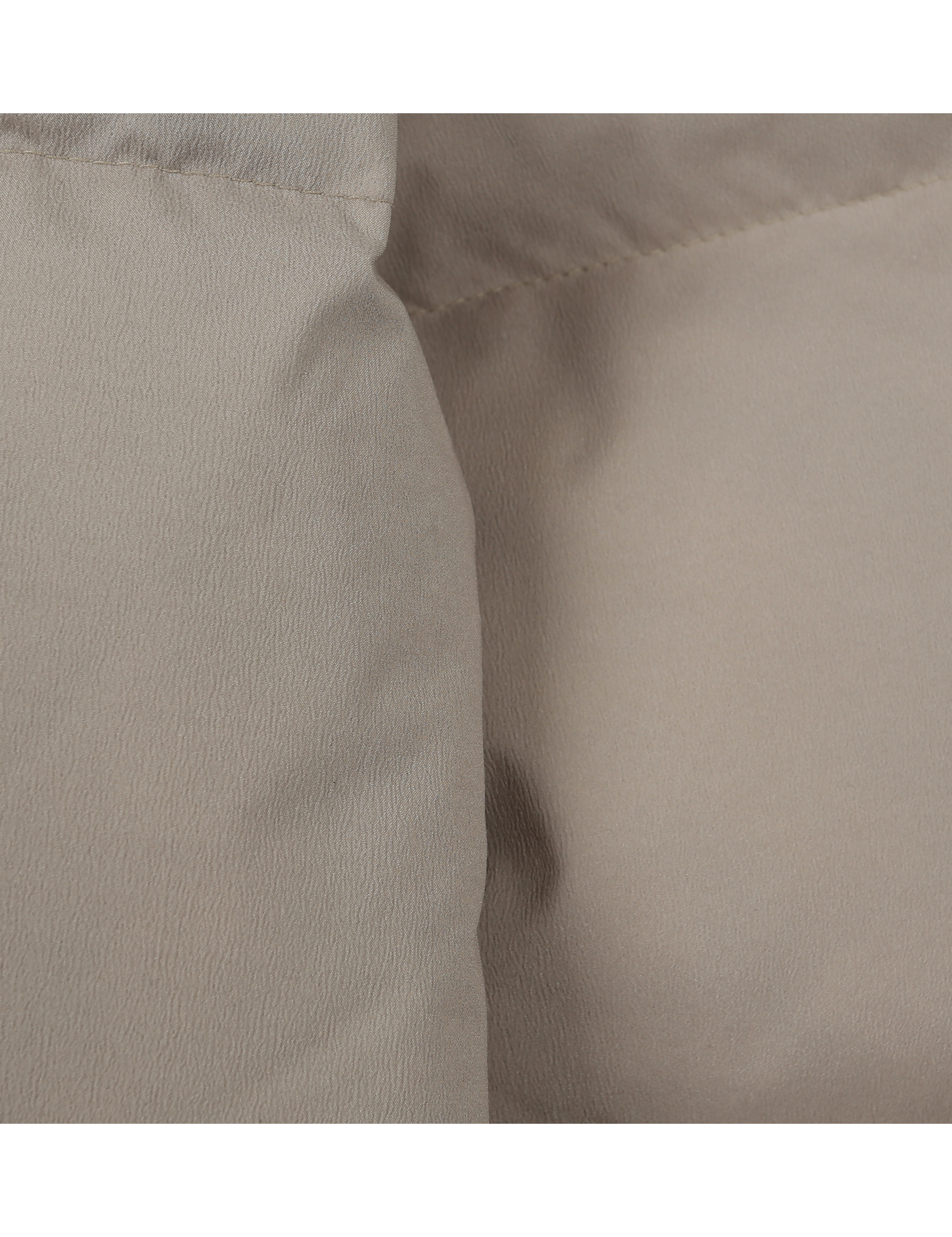 가볍고 소프트한 터치감의 폴리 와샤 원단 백면에 투명 필름지 처리를해 적당한 고시감과 다운리스를 최소화한 원단 사용.