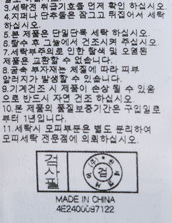 | 세탁방법 및 취급시 주의사항 | 본 제품은 손세탁 하십시오.(케어라벨참고) |