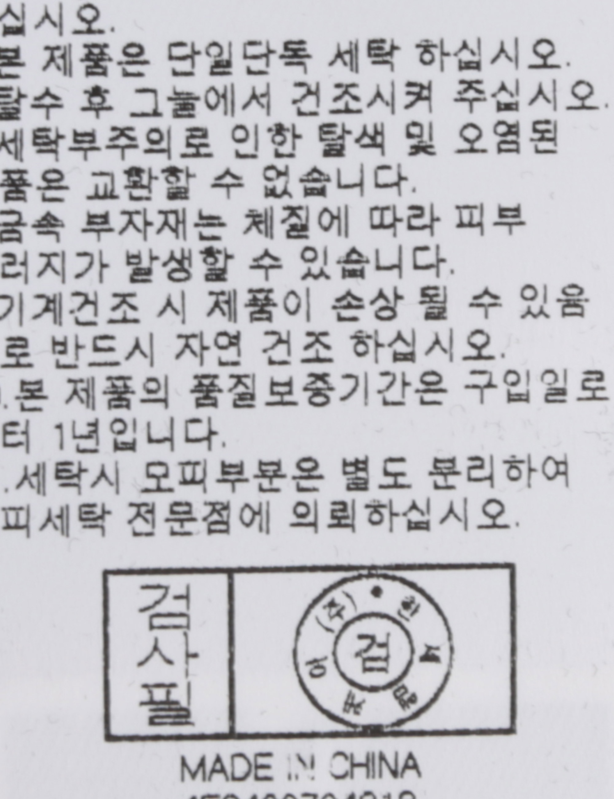| 세탁방법 및 취급시 주의사항 | 본 제품은 손세탁 하십시오.(케어라벨참고) |