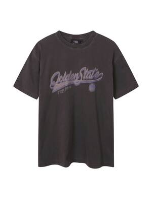 - 텐션이 좋은 RIB을 사용하여 넥라인을 잡아주고 빈티지한 크랙 기법을 사용한 아치형 아트웍 프린트가 포인트가 되는 스타일