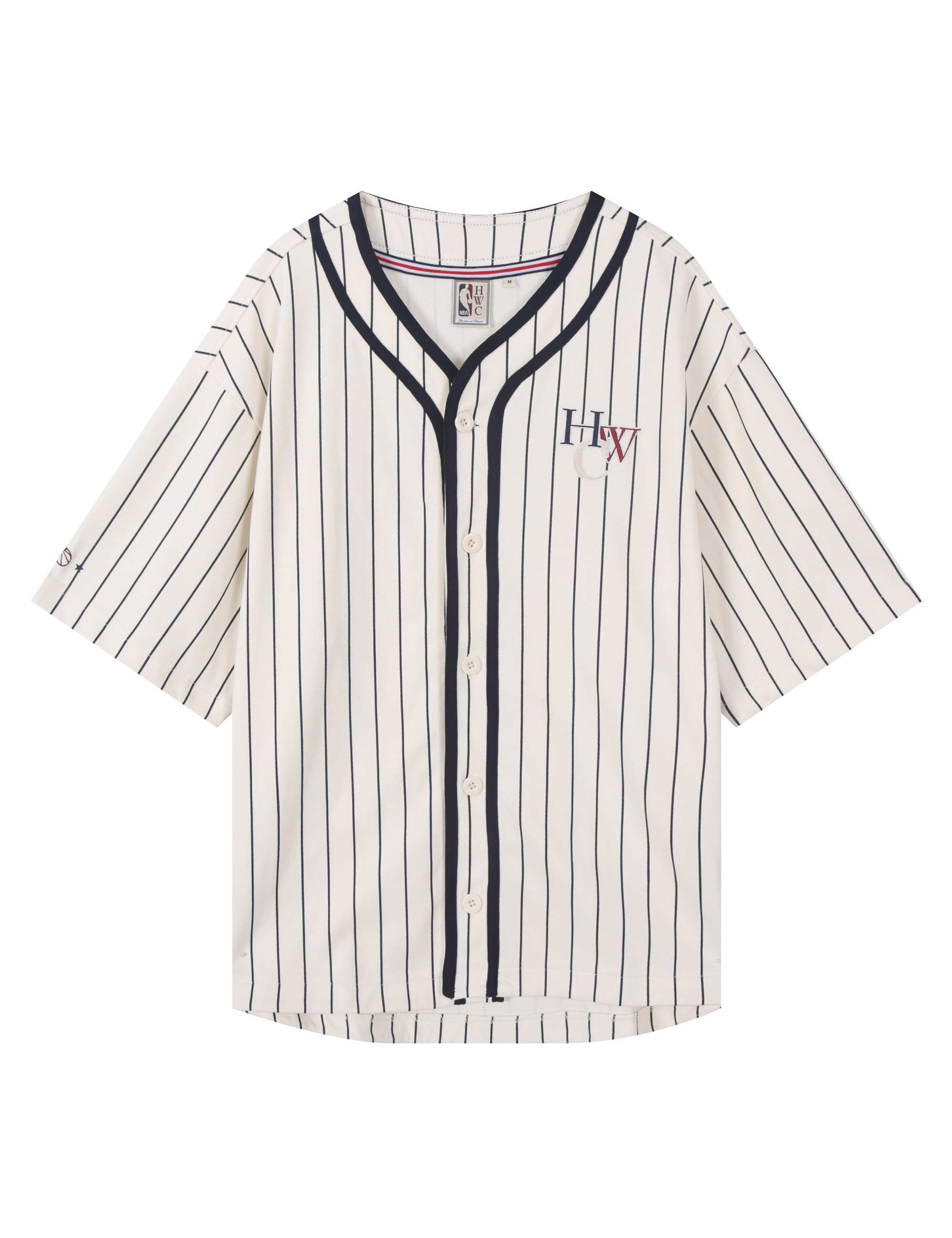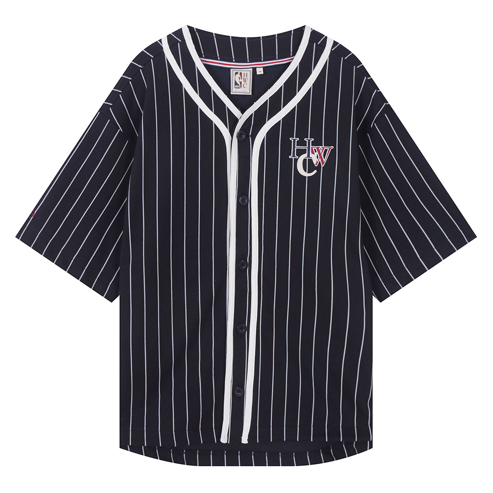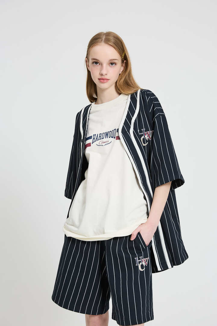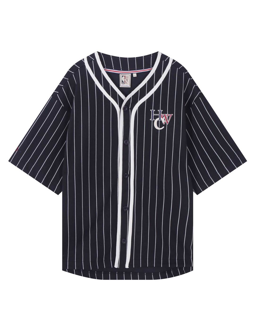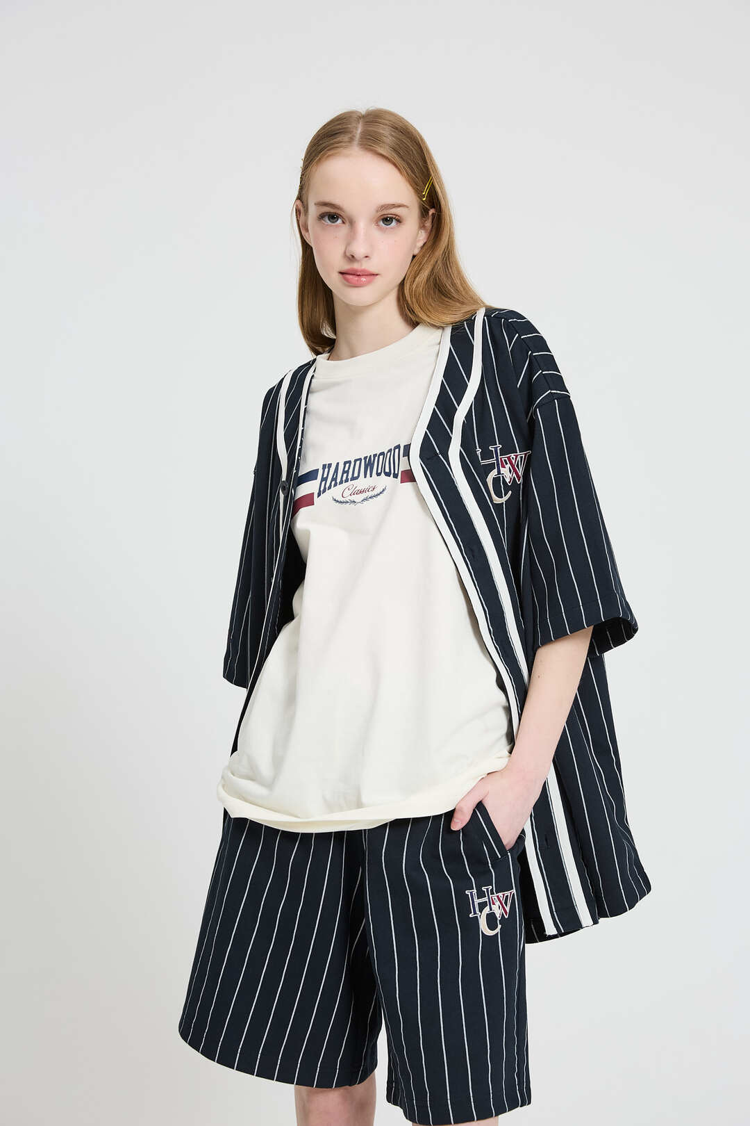 은은한 반라바 기법의 스트라이프 프린팅과 베이스볼 져지 디테일을 HWC 만의 무드로 표현함