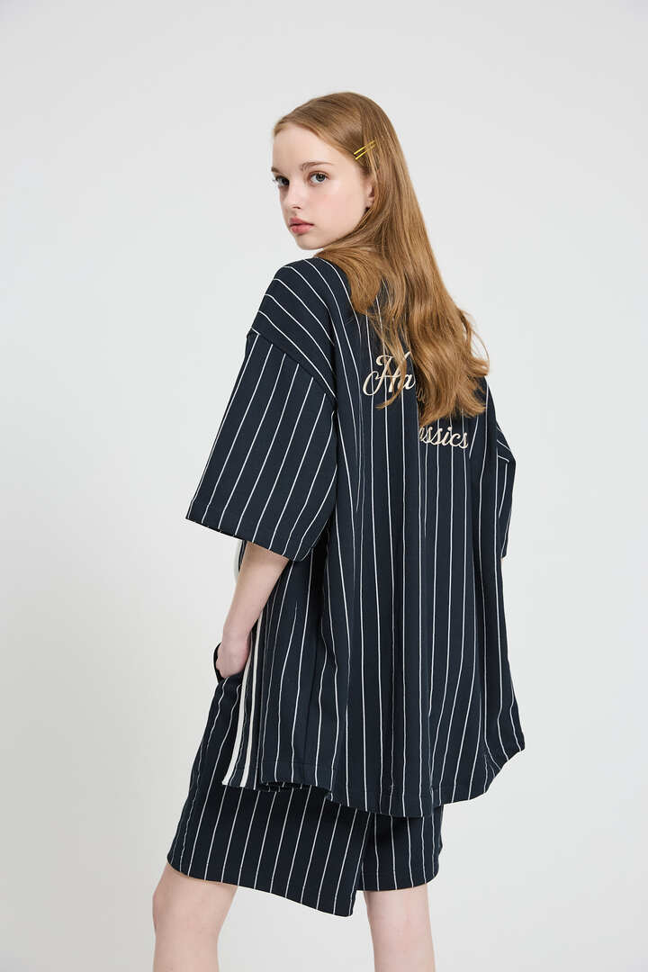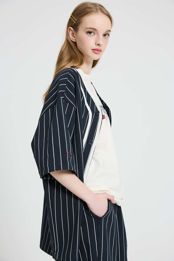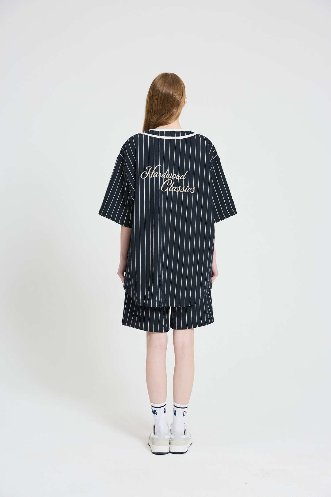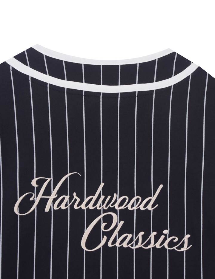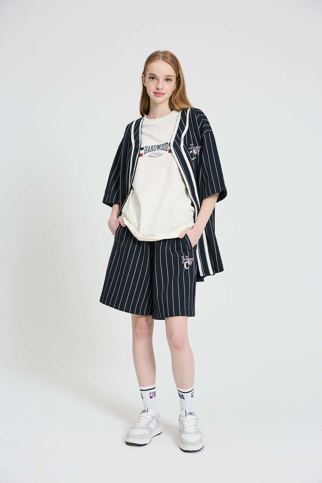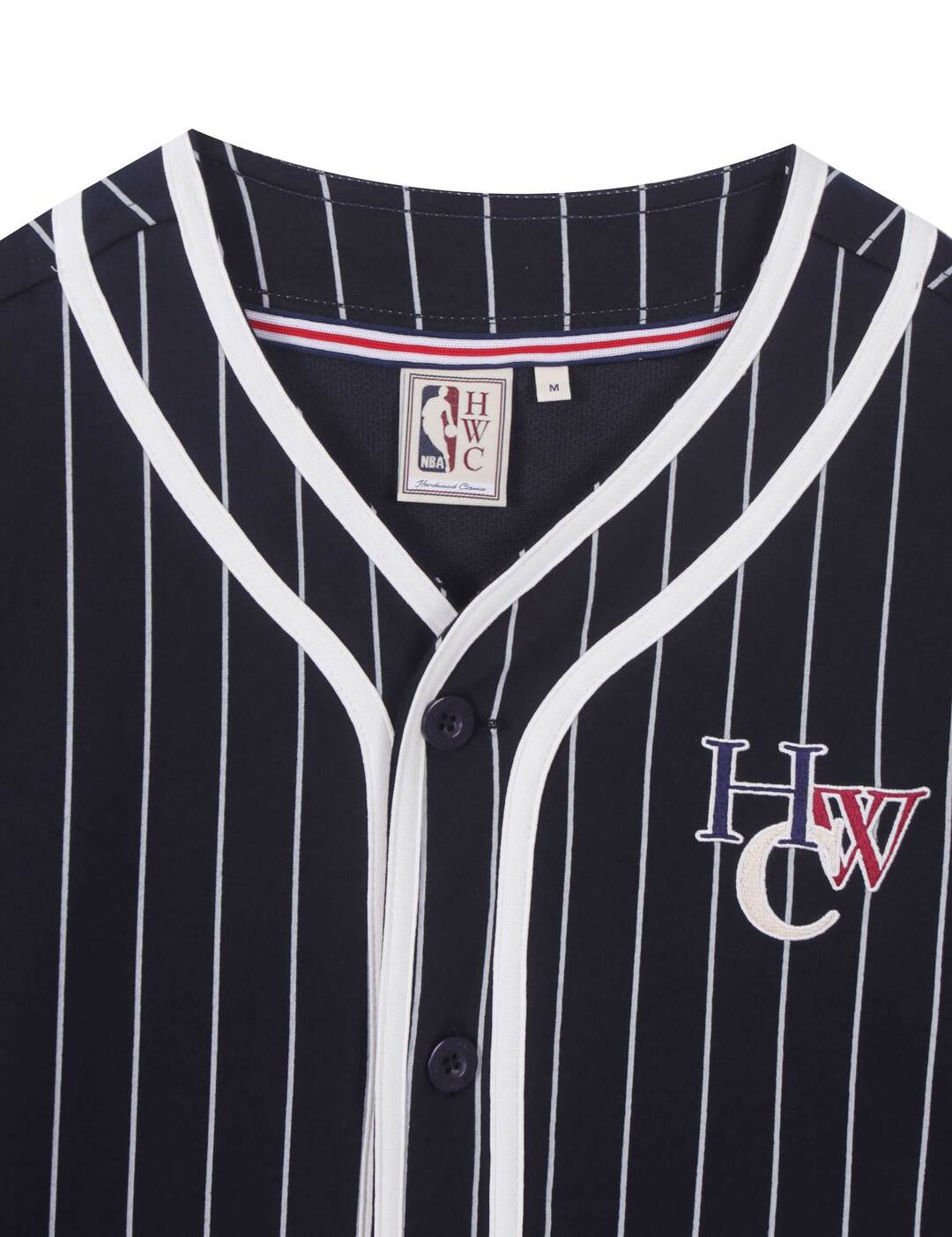 은은한 반라바 기법의 스트라이프 프린팅과 베이스볼 져지 디테일을 HWC 만의 무드로 표현함