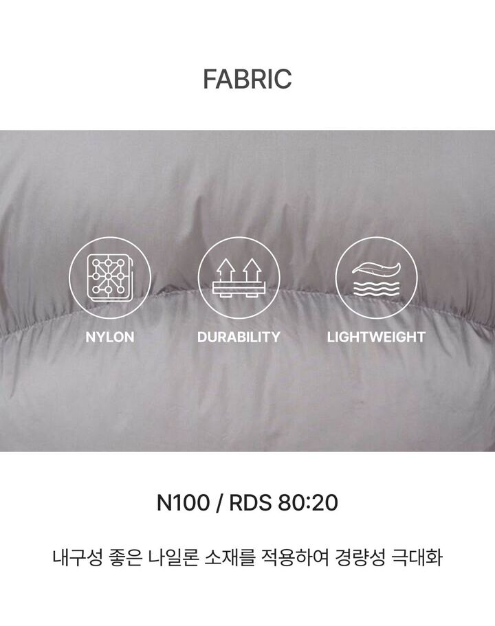 브랜드 홈 바로가기| 제품소재 | [겉감]나일론100% [안감]폴리에스터100% [충전재]우모(오리)솜털80% 깃털20% |
