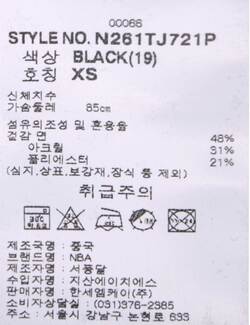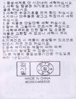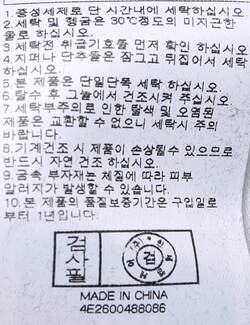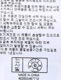 | 세탁방법 및 취급시 주의사항 | 중성세제로 단 시간내에 세탁하십시오.(케어라벨참고) |