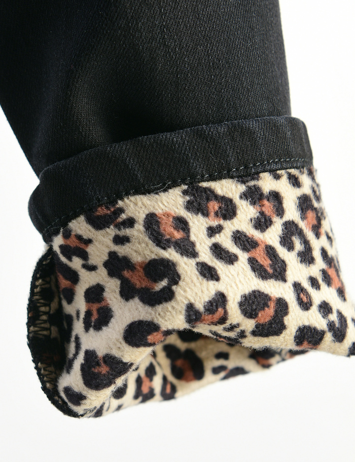 호피 무늬의 플리스 기모 안감이있어 바깥으로 접어서 연출이 가능한 허리밴딩 처리된 풀온 데님