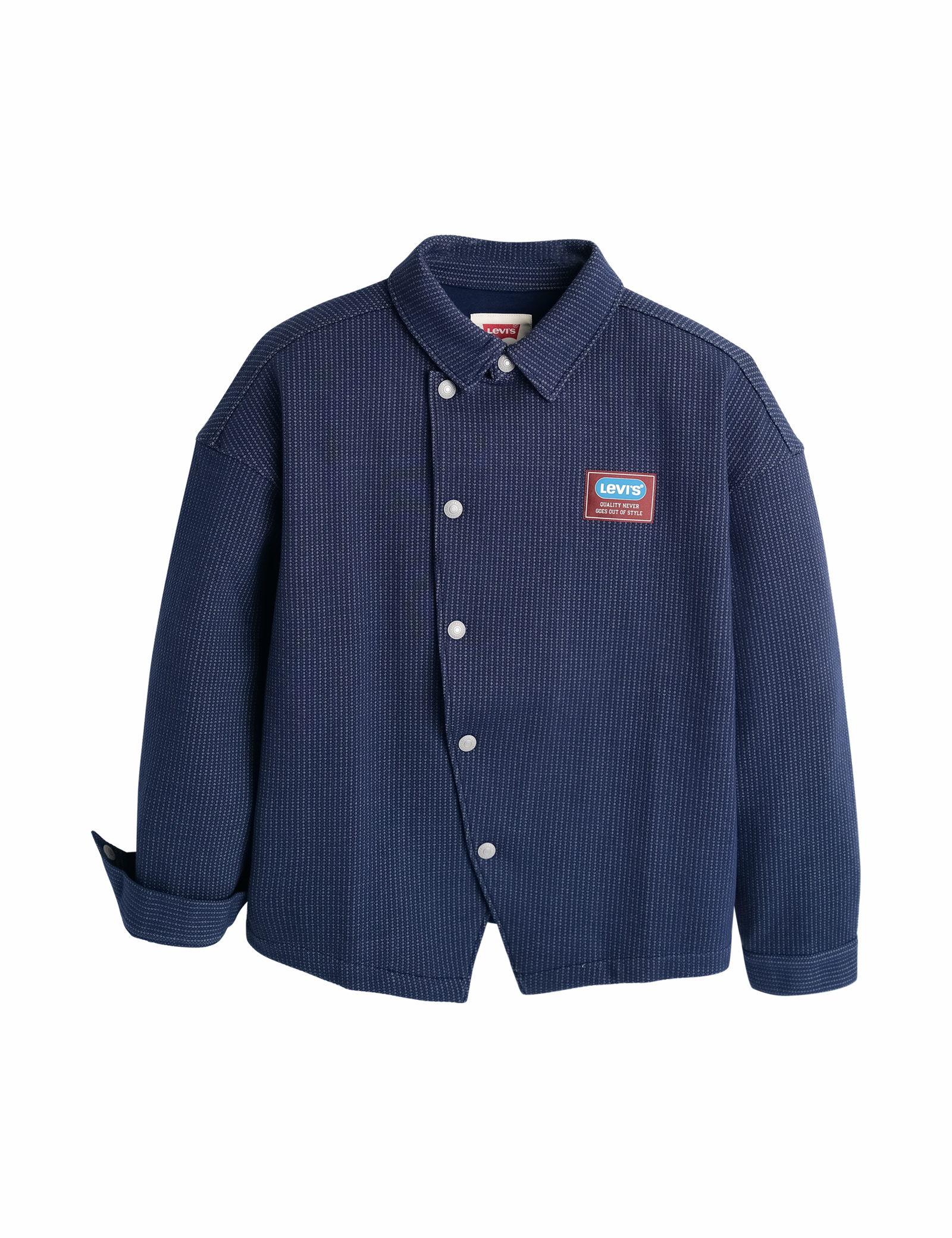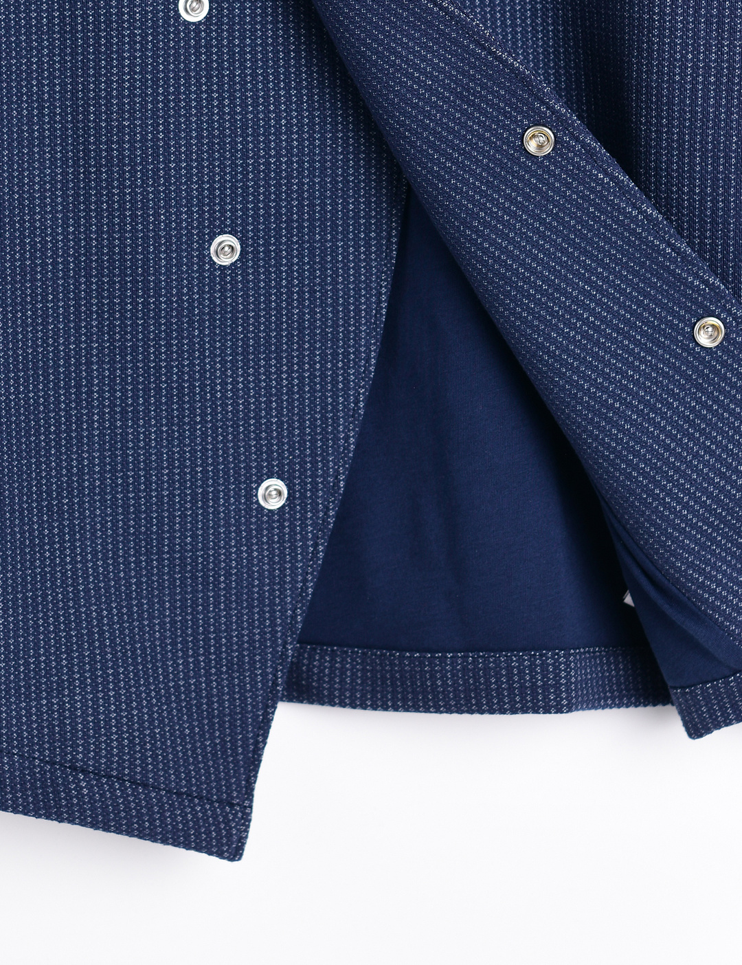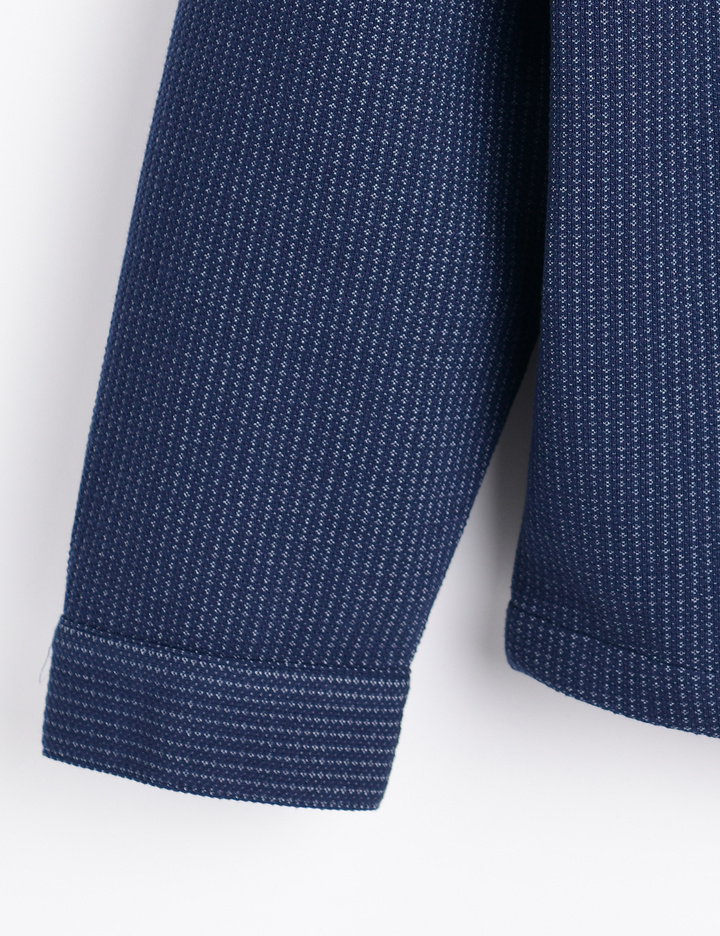 스냅단추로 착용이 편리하며, 가슴에 패치와 언발란스한 앞단 라인이 포인트인 부드러운 소재의 셔츠형 자켓