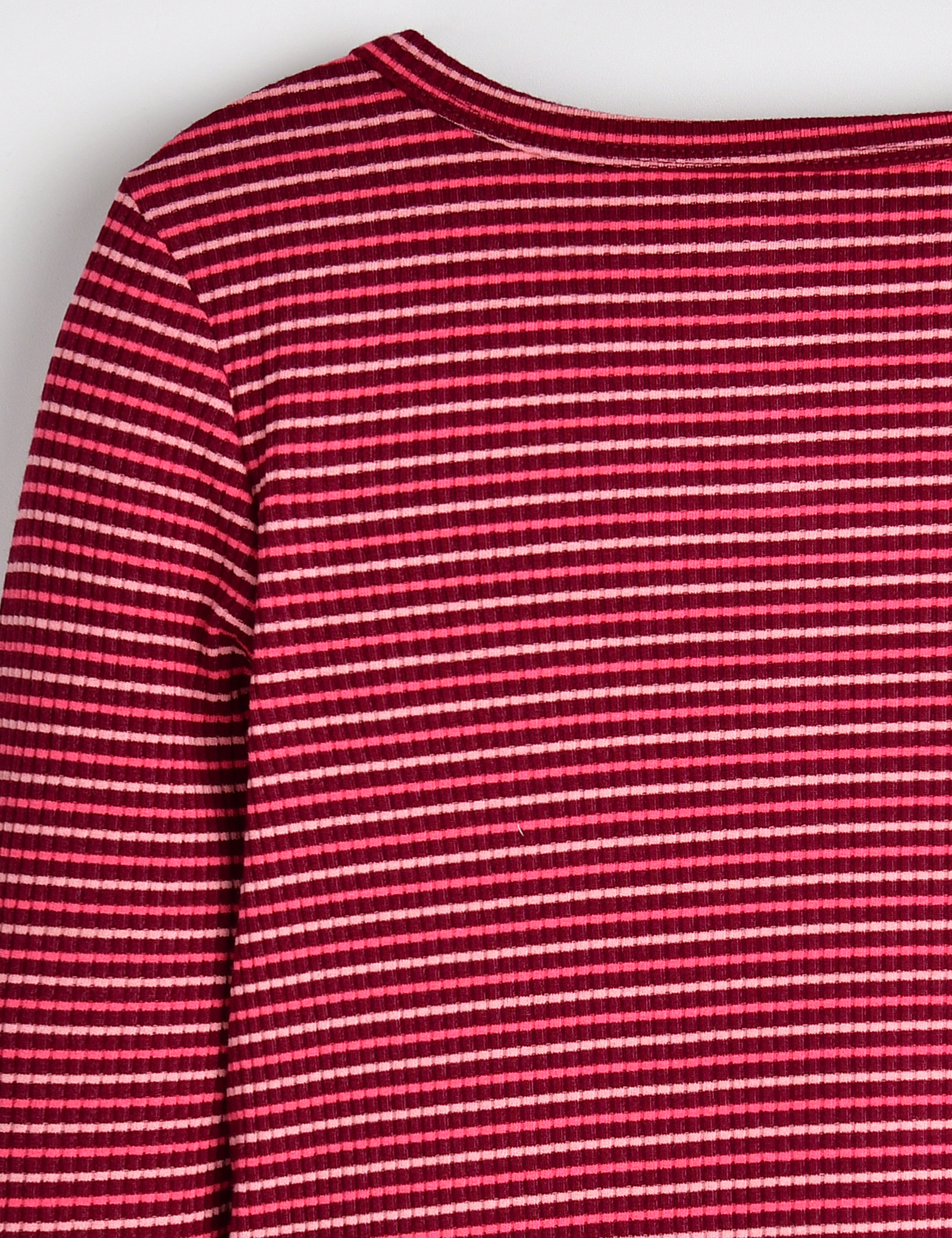 전체적으로 스트라이프 패턴이 들어가 있으며, 밑단이 프린지 처리된스퀘어넥 라인의 여아 긴팔 티셔츠